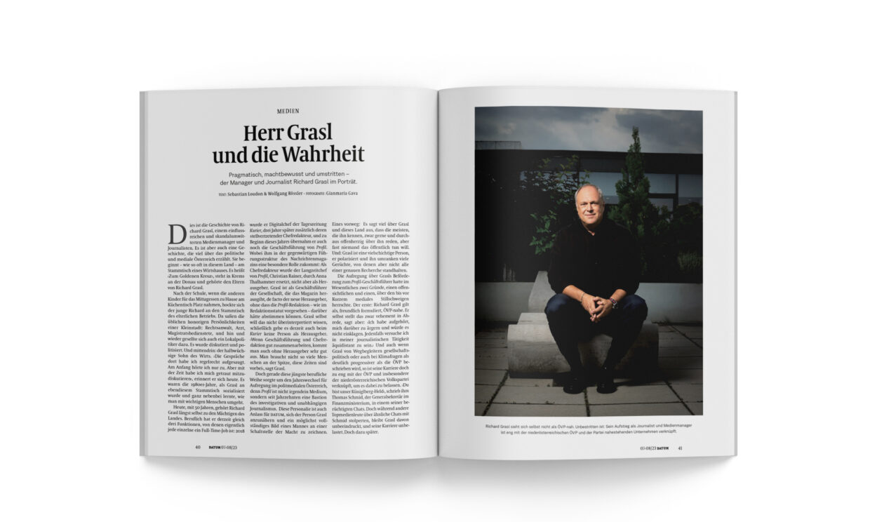 Für langjährige Beobachter Grasls ist eines klar: Er sieht sich als Journalist, ist aber eher in den Sphären der Politik zu Hause. Wenn ihm das jemand ins Gesicht sagt, ärgert er sich gehörig darüber. Was jedenfalls stimmt: Grasl changiert zwischen Journalismus und den machtpolitischen Dimensionen des Medienmanagements. Diese Zweigleisigkeit, die seine Karriere geprägt hat, ist derzeit sogar beruflich institutionalisiert: Als stellvertretender Chefredakteur des Kurier greift er selbst in die Tasten und bestimmt die Blattplanung mit, als Onlinechef der Zeitung soll er die digitale Transformation vorantreiben, und als Profil-Geschäftsführer das in den vergangenen Jahren in massive wirtschaftliche Turbulenzen geratene Traditionsmagazin sanieren. Und viele in der Medienwelt fragen sich, wohin den Pragmatiker sein nächster Karriereschritt führt: Als Nachfolger von Thomas Kralinger in die Geschäftsführung des Kurier und möglicherweise sogar der Mediaprint, der mächtigen Vertriebs- und Vermarktungstochter von Kronen Zeitung und Kurier? Oder doch zum Nachfolger der Kurier-Chefredakteurin Martina Salomon, deren Vertrag gerade um ein Jahr bis Herbst 2024 verlängert wurde? Eines steht jedenfalls fest: Raiffeisen setzt konsequent auf Richard Grasl, und er wiederum dankt es dem Konzern mit absoluter Loyalität. Zum Schluss also die Frage, wo er selbst seine berufliche Zukunft sieht. ›Ist Ihnen das nicht klar? Nein? Mir übrigens auch nicht‹, antwortet er lachend. Aber ob das auch die Wahrheit ist? •