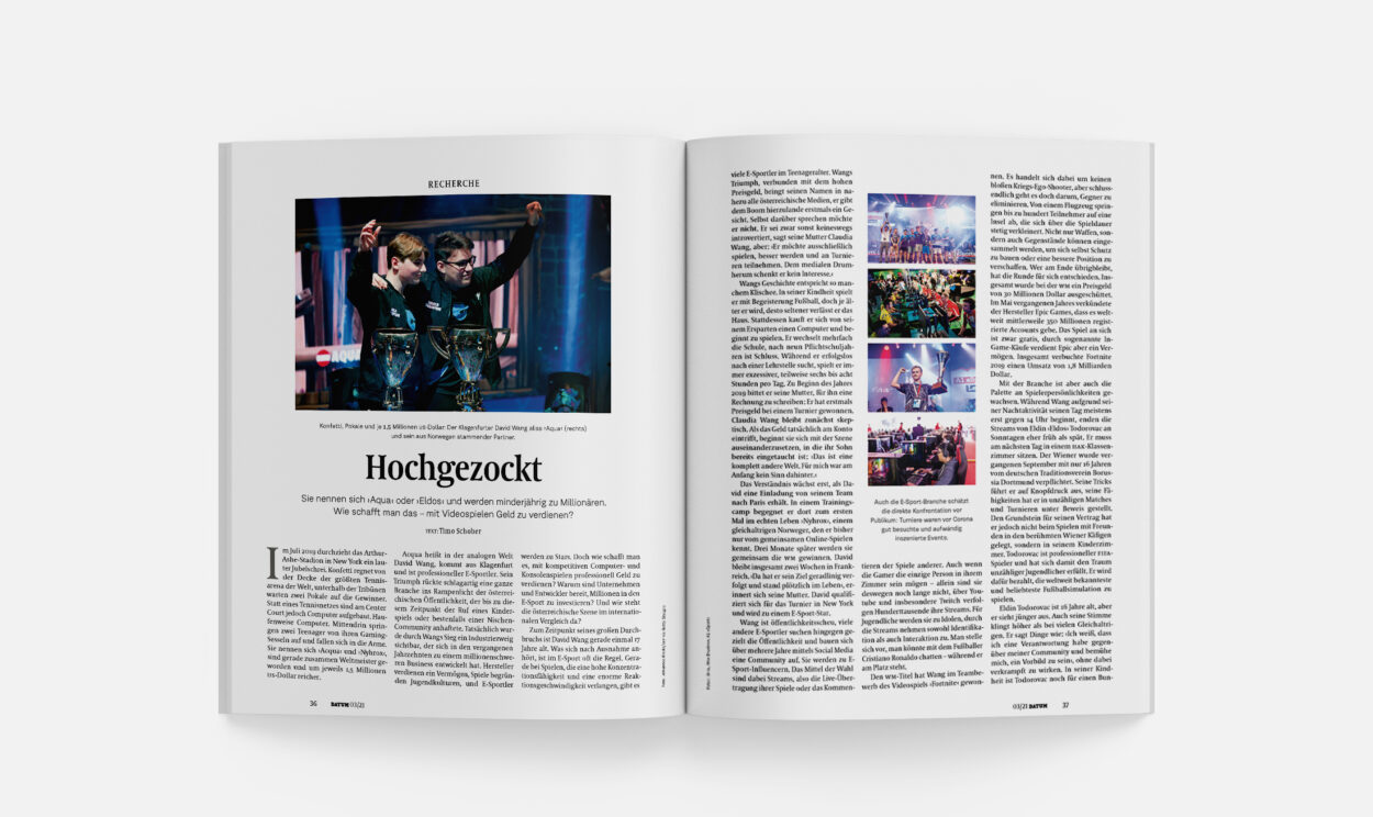 Zum Zeitpunkt seines großen Durchbruchs ist David Wang gerade einmal 17 Jahre alt. Was sich nach Ausnahme anhört, ist im E-Sport oft die Regel. Gerade bei Spielen, die eine hohe Konzentrationsfähigkeit und eine enorme Reaktionsgeschwindigkeit verlangen, gibt es viele E-Sportler im Teenageralter. Wangs Triumph, verbunden mit dem hohen Preisgeld, bringt seinen Namen in nahezu alle österreichische Medien, er gibt dem Boom hierzulande erstmals ein Gesicht. Selbst darüber sprechen möchte er nicht. Er sei zwar sonst keineswegs introvertiert, sagt seine Mutter Claudia Wang, aber : ›Er möchte ausschließlich spielen, besser werden und an Turnieren teilnehmen. Dem medialen Drumherum schenkt er kein Interesse. ‹