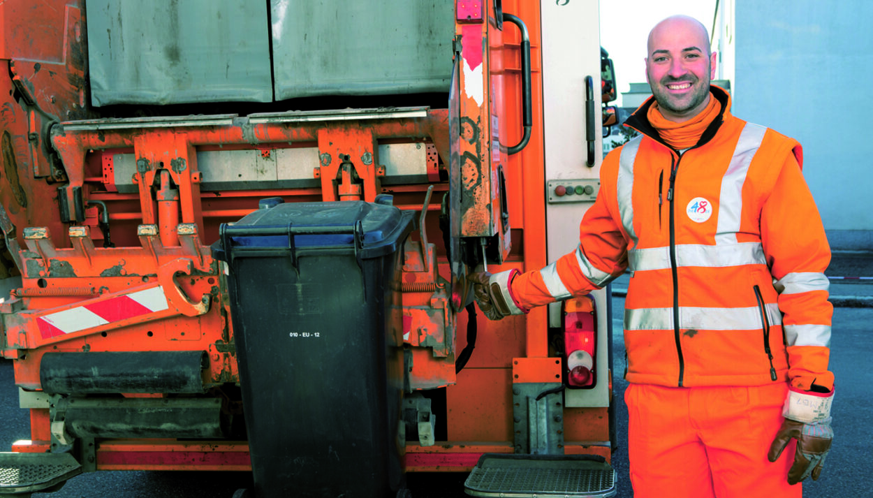 Je nach Strecke arbeiten wir in Teams von zwei bis fünf Leuten. In Wohnhäusern müssen wir in die Keller runter, das ist aufwendig. Es gibt dann einen Vorausträger, der die Tonnen heraufholt. Der Fahrer kommt mit dem Wagen und der Kipper leert die Behälter aus. Leerträger bringen sie zurück.