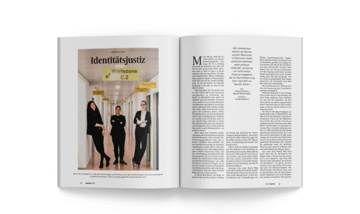 Mitte Februar stellt der leitende Richter am Wiener Verwaltungsgericht eine Frage, die er so womöglich noch nie formuliert hat: ›Wie soll ich Sie jetzt ansprechen? Weil »Herr«, das passt ja nicht so ganz.‹ Er blickt wartend auf sein Gegenüber. Vor ihm sitzt Sebastian Elisa. Blaues, halblanges Haar, lackierte Nägel, ein Regenbogenband hält die Uhr an seinem Handgelenk. So öd die Räume im Verhandlungssaal C1.06 sind, so bunt ist der Mensch darin.