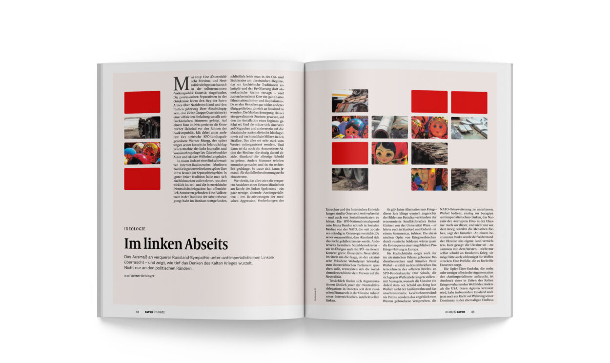 Verständnis für Putin äußerten auch Sozialdemokraten und Grüne, und das schon nach der völkerrechtswidrigen Krim-Annexion 2014. Eine ›vielfältige Persönlichkeit‹ sei Putin, sagte SPÖ-Parlamentarier und Ex-Vizepräsident der ›Österreichisch-Russischen Freundschaftsgesellschaft‹ Christoph Matznetter damals in einer ATV-Diskussion. Es sei ›falsch, Russland die Urheberschaft des Konflikts zuzuweisen‹, war sich der ehemalige Grüne EU-Parlamentarier Johannes Voggenhuber sicher. Dass Positionen ähnlich jener der ›Antiimperialisten‹ tatsächlich maßgeblich in sozialdemokratische oder grüne Milieus hineinreichen, glaubt der Politikwissenschafter Anton Pelinka nicht. Ein ›stark ausgeprägter Antiamerikanismus in Verbindung mit Antikapitalismus‹ sei zwar traditionell anzutreffen bei Teilen der Linken, teils auch in der Sozialdemokratie: ›Auffällig ist, dass die Frage nach der Demokratiequalität, von der ja sonst so oft die Rede ist, offenbar keine Rolle spielt.‹ Nach einer fairen Wahl habe Wolodymyr Selenskyj das Präsidentenamt errungen – ›In Russland hat noch nie ein Präsident eine Wahl verloren‹, sagt Pelinka: ›Wenn ein Linker für das politische System Russlands irgendwelche Sympathien hat, ist er kein Linker mehr.‹ Manchen Sozialdemokraten hingegen – Pelinka nennt das Beispiel Heinz Fischers – sei vorzuwerfen, erst mit dem russischen Überfall im Februar von ihrem ›Putinversteher-Kurs‹ abgerückt zu sein. Tatsächlich zog sich auch Ex-Kanzler Christian Kern erst nach dem 24. Februar aus seiner Funktion in den russischen Staatsbahnen zurück. Der eindeutige Bruch des Völkerrechts durch Russland 2014 sei ›damals nicht als solcher benannt worden‹, sagt der Politikwissenschaftler.