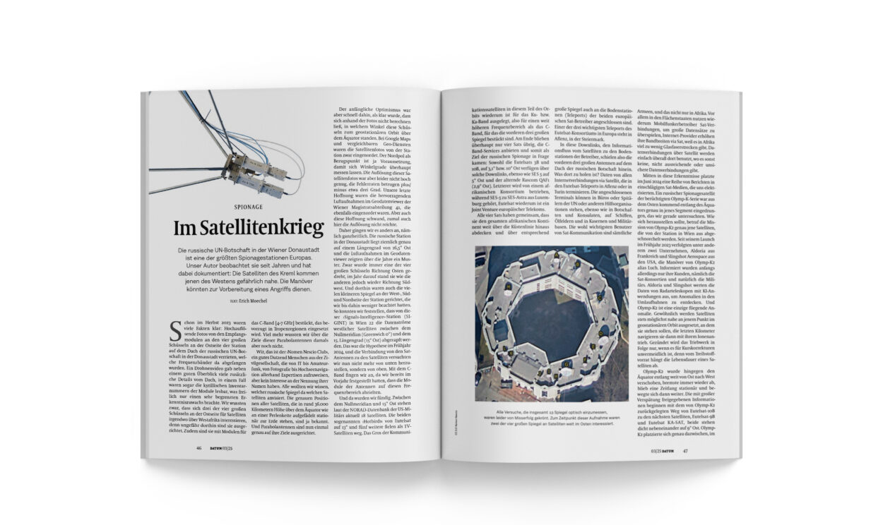 Wir, das ist der ›Nomen Nescio Club‹, ein gutes Dutzend Menschen aus der Zivilgesellschaft, die von IT bis Amateurfunk, von Fotografie bis Hochseenavigation allerhand Expertisen aufzuweisen, aber kein Interesse an der Nennung ihrer Namen haben. Alle wollten wir wissen, welcher russische Spiegel da welchen Satelliten anvisiert. Die genauen Positionen aller Satelliten, die in rund 36.000 Kilometern Höhe über dem Äquator wie an einer Perlenkette aufgefädelt stationär zur Erde stehen, sind ja bekannt. Und Parabolantennen sind nun einmal genau auf ihre Ziele ausgerichtet.
