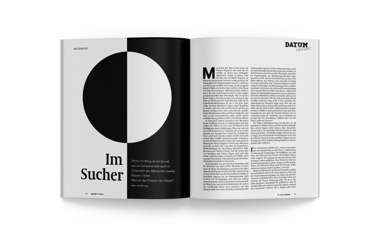 Ausprägungen von systemischem Rassismus sind für Menschen mit nicht-weißer Hautfarbe in Österreich oft Alltag. Die Beifügung ›systemisch‹ hat dabei folgende Bedeutung: Werden Berichte rassistisch motivierter Kontrollen von den Kontrolleuren häufig als Einzelfälle abgetan, hat die Diskriminierung nachweislich eine durchgängige und nicht nur anekdo-tische Dimension. Dabei reproduzieren sich innerhalb der Polizei jene rassistischen Denkmuster, die auch in der Gesellschaft immer noch existieren, wie Sina Aping festhält, die an der Uni Wien zu kritischer Rassismusanalyse forscht. In dieser Hinsicht könne auch von institutionellem Rassismus gesprochen werden, in dem Personen mit nicht-weißer Hautfarbe weiterhin die Zugehörigkeit zur Mehrheitsgesellschaft abgesprochen werde. Aus den Statistiken der FRA lässt sich dabei ablesen, dass Männer etwa drei Mal so häufig wie Frauen betroffen sind. ›Schwarze Männer werden einfach viel häufiger als Bedrohung gesehen und kriminalisiert als Frauen, die in diesem Zusammenhang eher eine geschütztere Rolle einnehmen‹, erklärt Sina Aping. Die Diskriminierung passiert an verschiedenen Orten des öffentlichen Lebens, im Verkehr oder gar vor der eigenen Haustüre. Was für Außenstehende schnell erledigt erscheinen mag, wirkt in den Gedanken der diskriminierten Personen lange nach. Wie das aussieht, haben Noam, Rahim, Max und Raissa DATUM erzählt und die dabei wieder aufkommenden unangenehmen Gefühle in Kauf genommen. Sind sich Streifenpolizisten wie auch die Verantwortlichen des Innenministeriums des Problems, das in Wahrheit ja weniger das der Betroffenen, sondern eher das der -Polizei selbst ist, bewusst?