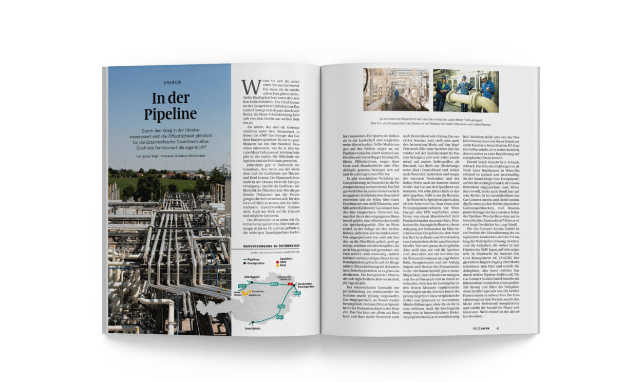 Der österreichische Gasmarkt war jahrzehntelang ein traditioneller: Im Sommer wurde günstig eingekauftes Gas eingespeichert, im Winter wieder hervorgeholt. ›Sommer/Winter-Spread‹ heißt der Preisunterschied in der Branche. Das Gas kam vor allem aus Russland und floss durch Österreich auch nach Deutschland oder Italien. Der verrückte Sommer 2022 stellt aber auch den heimischen Markt auf den Kopf: Österreich füllt seine Speicher (bis November soll der Speicherstand 80 Prozent betragen) und setzt dabei zunehmend auf andere Lieferquellen als Russland. Gas fließt aus (beziehungsweise über) Deutschland und Italien nach Österreich. Außerdem wird wegen der enormen Trockenheit und der hohen Preise auch im Sommer immer wieder mal Gas aus den Speichern entnommen. Vor zehn Jahren hätte es das nicht gegeben, heißt es aus der Branche.