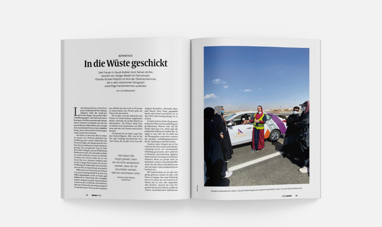 Als im Jahr 2018 das Fahrverbot für Frauen in Saudi-Arabien aufgehoben wurde, entstand ein großer Bedarf an Fahrschulen – für Frauen : Denn Frauen dürfen nicht gemeinsam mit Männern und nur von Frauen unterrichtet werden. › Da kamen wir ins Spiel ‹, sagt Claudia Gruber-Filippits. › Wir ‹, das ist die Test and Training International (TTI), eine Firma, die im Jahr 2006 vom ehemaligen Rennfahrer Alexander Wurz und dessen Vater Franz gegründet wurde und darauf spezialisiert ist, in aller Welt Fahrtrainingsanlagen zu errichten.