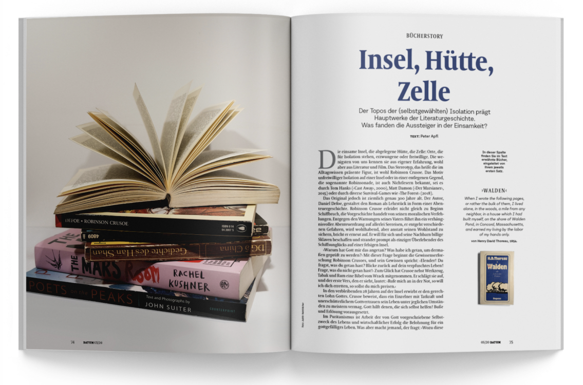 Die einsame Insel, die abgelegene Hütte, die Zelle: Orte, die für Isolation stehen, erzwungene oder freiwillige. Die wenigsten von uns kennen sie aus eigener Erfahrung, wohl aber aus Literatur und Film. Das Stereotyp, das heißt die im Alltagswissen präsente Figur, ist wohl Robinson Crusoe. Das Motiv unfreiwilliger Isolation auf einer Insel oder in einer entlegenen Gegend, die sogenannte Robinsonade, ist auch Nichtlesern bekannt, sei es durch Tom Hanks (› Cast Away ‹, 2000), Matt Damon (› Der Marsianer ‹, 2015) oder durch diverse Survival-Games wie › The Forest ‹ (2018).