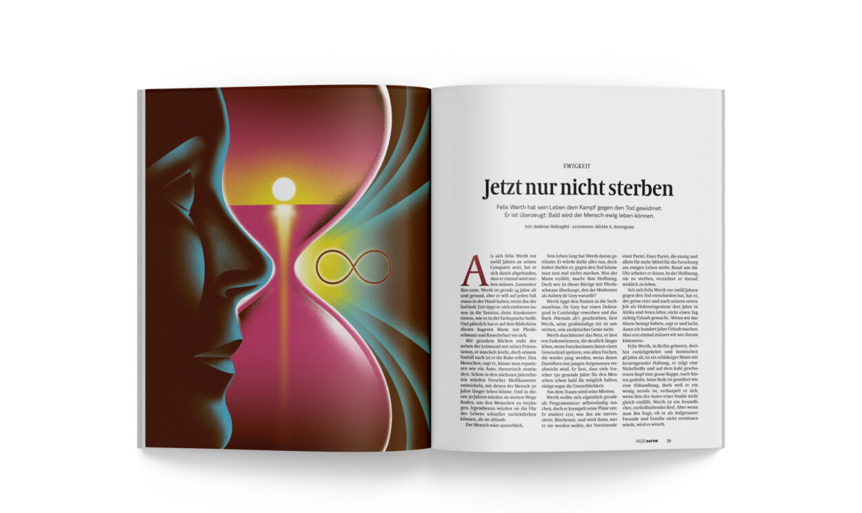 Als sich Felix Werth vor zwölf Jahren an seinen Computer setzt, hat er sich damit abgefunden, dass er einmal wird sterben müssen. Zumindest fürs erste. Werth ist gerade 34 Jahre alt und gesund, aber er will auf jeden Fall etwas in der Hand haben, wenn ihn der Tod holt. Erst tippt er ›sich einfrieren lassen‹ in die Tastatur, dann ›kryokonservieren‹, wie es in der Fachsprache heißt. Und plötzlich hat er auf dem Bildschirm diesen hageren Mann mit Pferdeschwanz und Rauschebart vor sich.