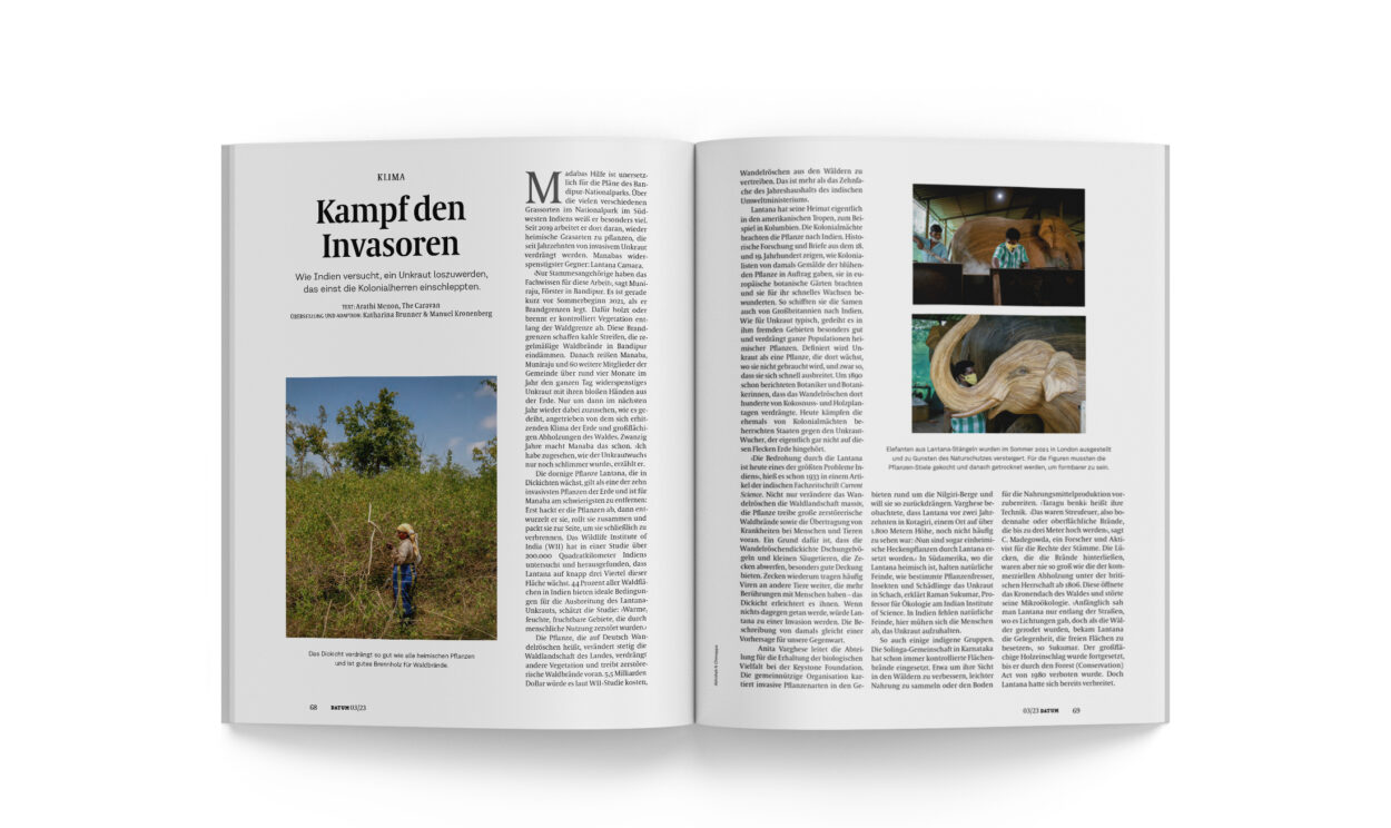Die dornige Pflanze Lantana, die in Dickichten wächst, gilt als eine der zehn invasivsten Pflanzen der Erde und ist für Manaba am schwierigsten zu entfernen: Erst hackt er die Pflanzen ab, dann entwurzelt er sie, rollt sie zusammen und packt sie zur Seite, um sie schließlich zu verbrennen. Das Wildlife Institute of India (WII) hat in einer Studie über 200.000 Quadratkilometer Indiens untersucht und herausgefunden, dass Lantana auf knapp drei Viertel dieser Fläche wächst. 44 Prozent aller Waldflächen in Indien bieten ideale Bedingungen für die Ausbreitung des Lantana-Unkrauts, schätzt die Studie: ›Warme, feuchte, fruchtbare Gebiete, die durch menschliche Nutzung zerstört wurden.‹