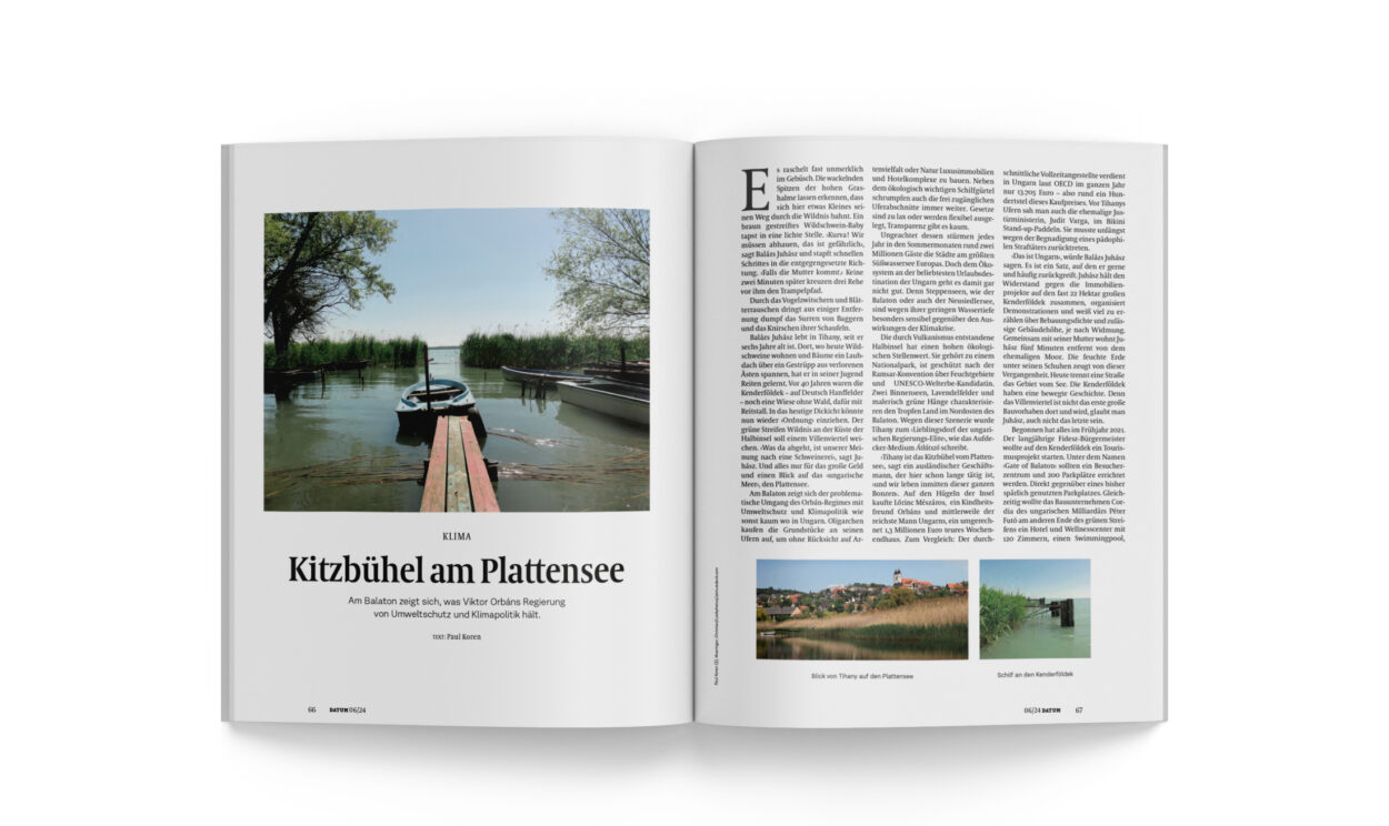 Balázs Juhász lebt in Tihany, seit er sechs Jahre alt ist. Dort, wo heute Wildschweine wohnen und Bäume ein Laubdach über ein Gestrüpp aus verlorenen Ästen spannen, hat er in seiner Jugend Reiten gelernt. Vor 40 Jahren waren die Kenderföldek – auf Deutsch Hanffelder – noch eine Wiese ohne Wald, dafür mit Reitstall. In das heutige Dickicht könnte nun wieder ›Ordnung‹ einziehen. Der grüne Streifen Wildnis an der Küste der Halbinsel soll einem Villenviertel weichen. ›Was da abgeht, ist unserer Meinung nach eine Schweinerei‹, sagt Juhász. Und alles nur für das große Geld und einen Blick auf das ›ungarische Meer‹, den Plattensee.