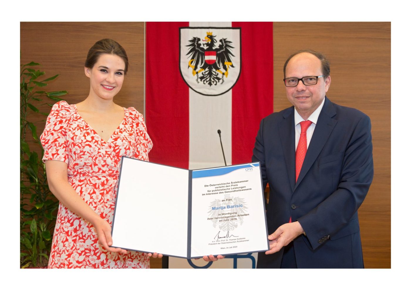ÖAK-Präsident Thomas Szekeres überreichte vergangene Woche den „Preis für besondere publizistische Leistungen im Interesse des Gesundheitswesens„ an Marija Barišić und Hans-Jörg Bruckberger. Mit diesem Preis zeichnet die ÖÄK jährlich sorgfältig recherchierte und ausgewogen aufbereitete publizistische Arbeiten aus.