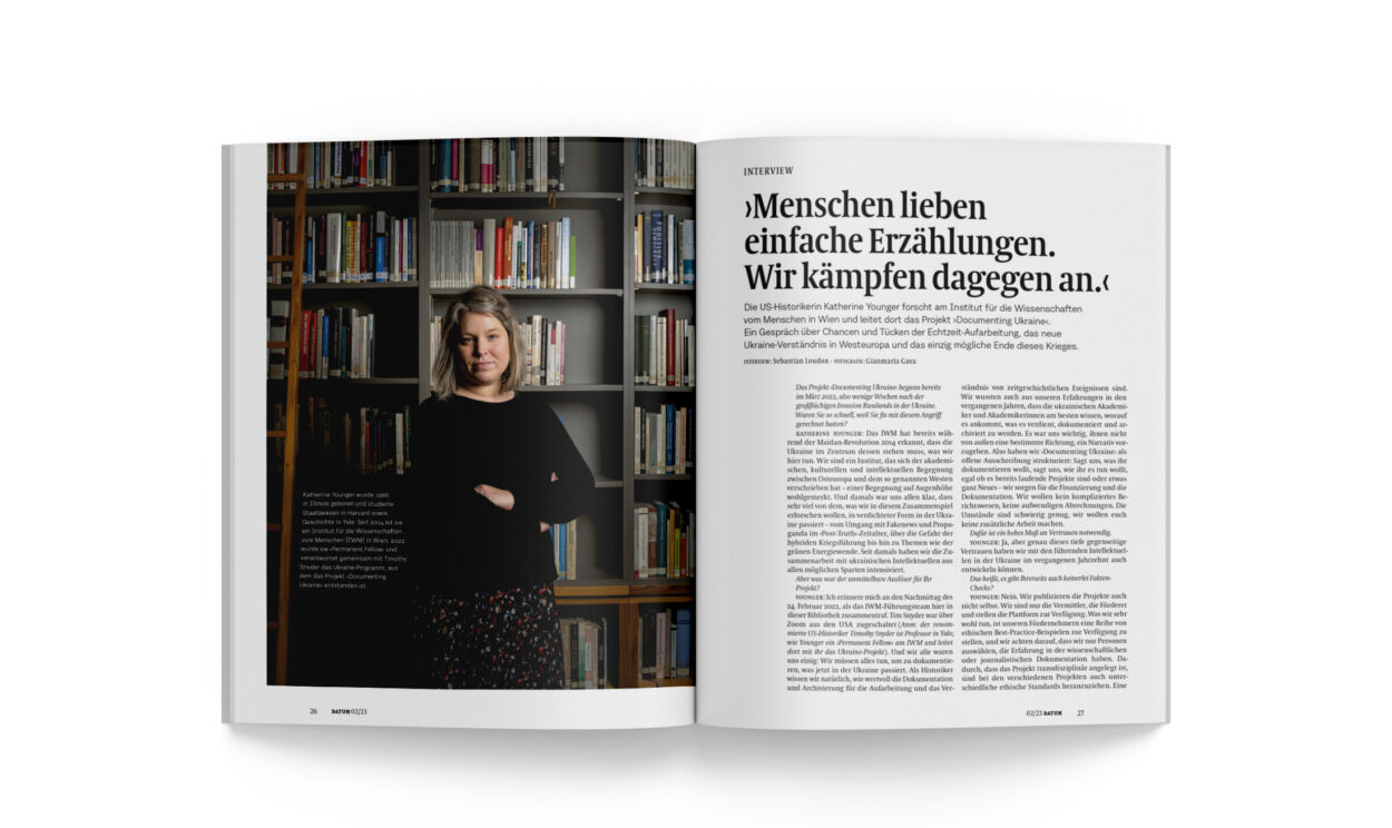 Die US-Historikerin Katherine Younger forscht am Institut für die Wissenschaften vom Menschen in Wien und leitet dort das Projekt ›Documenting Ukraine‹. Ein Gespräch über Chancen und Tücken der Echtzeit-Aufarbeitung, das neue Ukraine-Verständnis in Westeuropa und das einzig mögliche Ende dieses Krieges.