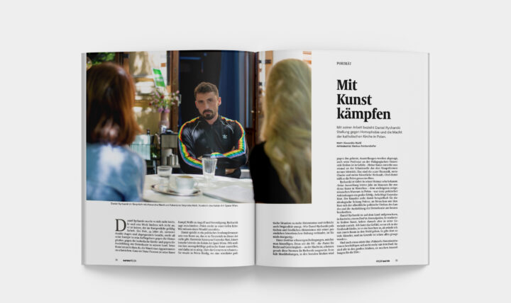 Daniel Rycharski macht es sich nicht leicht. Er und sein Werk biedern sich nicht an; er ist keiner, der im Rampenlicht gefällig lächelt. Der Pole, 34 Jahre alt, intensive dunkle Augen und abgespanntes Gesicht, steckt all seine Energie in sein Aufbegehren gegen die Homophobie, gegen die katholische Kirche und gegen die Aushöhlung der Demokratie in seinem Land. Seine Kunst ist nicht dazu da, die Wand eines Appartements zu schmücken. Ganz im Sinne Picassos ist seine Kunst Kampf, Waffe zu Angriff und Verteidigung. Rycharski sagt entschieden: › Polen steckt in einer tiefen Krise. Wir müssen einen Wandel anstoßen. ‹