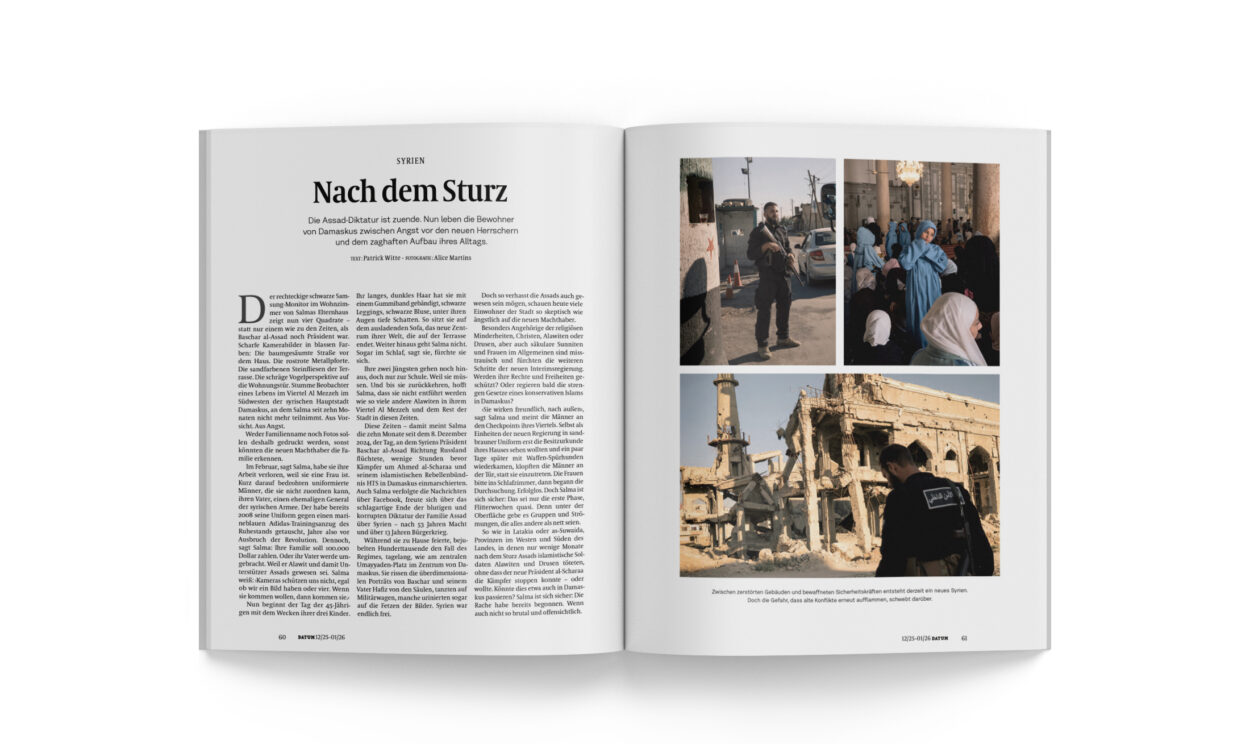Der rechteckige schwarze Samsung-Monitor im Wohnzimmer von Salmas Elternhaus zeigt nun vier Quadrate – statt nur einem wie zu den Zeiten, als Baschar al-Assad noch Präsident war. Scharfe Kamerabilder in blassen Farben: Die baumgesäumte Straße vor dem Haus. Die rostrote Metallpforte. Die sandfarbenen Steinfliesen der Terrasse. Die schräge Vogelperspektive auf die Wohnungstür. Stumme Beobachter eines Lebens im Viertel Al Mezzeh im Südwesten der syrischen Hauptstadt Damaskus, an dem Salma seit zehn Monaten nicht mehr teilnimmt. Aus Vorsicht. Aus Angst.