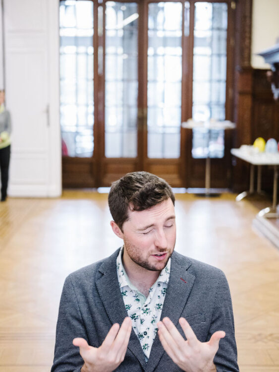 15:05 Dave Sinardet, Lockenkopf mit Hornbrille und dunkelblauem Anzug, entschuldigt sich für seine Verspätung. ›Die Straßenbahn hat plötzlich nicht mehr dort angehalten, wo sie sollte.‹ Das Klischee stimme, sagt er, Verkehrschaos gebe es in Brüssel öfter. Er zupft sein Sakko zurecht und eilt zum Fotografen.