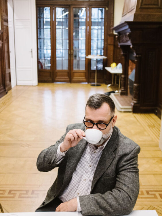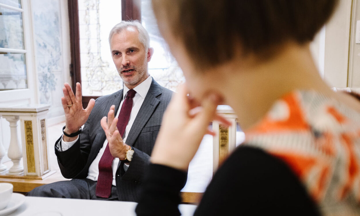 14:10 Ein Mann im beigen Wintermantel mit Ledertasche steht vor dem Eingang, schaut sich um und drückt nach einer Weile doch auf die Klingel. Es ist Gregor Schusterschitz, Karrierediplomat und Brexit-Verhandler. Schusterschitz hatte sich zunächst im Haus geirrt: ›Das alte Wien-Haus war doch woanders, oder? Ich glaube, ich war lange nicht mehr hier.‹ Seit sechs Uhr morgens ist Schusterschitz auf den Beinen. Von Luxemburg ist er in der Früh nach Brüssel gependelt, ›um 16 Uhr geht’s wieder zurück‹, sagt er und schenkt sich Kaffee ein.