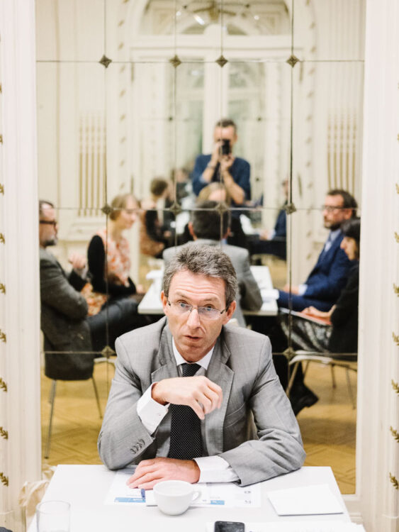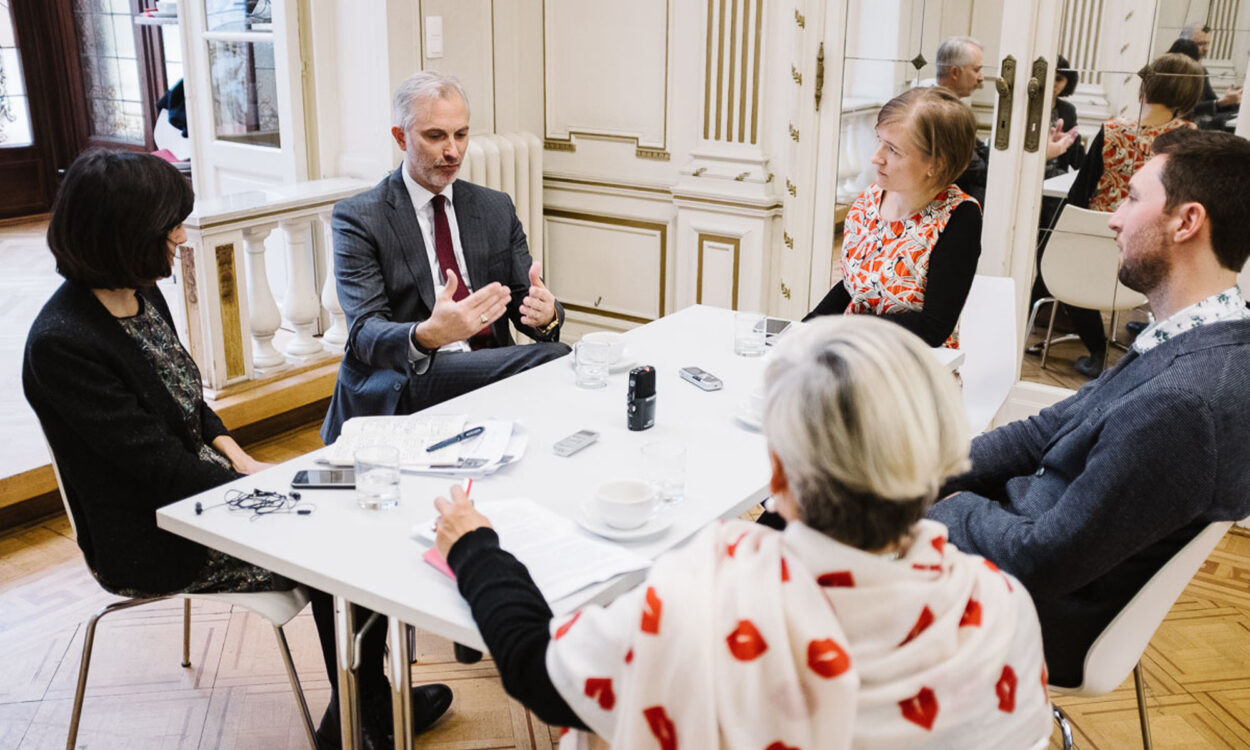 13:46 Bryn Watkins, ein fideler junger Mann vom ökonomischen Think-Tank ›Bruegel‹, betritt das Wien-Haus in Brüssel und geht mit großen Schritten auf den Diskussionstisch zu. ›Wie läuft das ab?‹, fragt der Brite auf Deutsch mit kantigem Akzent. Als zuerst Porträtfotos gemacht werden sollen, lacht er. ›Ich hasse es, fotografiert zu werden.‹ Mit einem ›Geschafft!‹ nimmt er Minuten später am Tisch Platz.