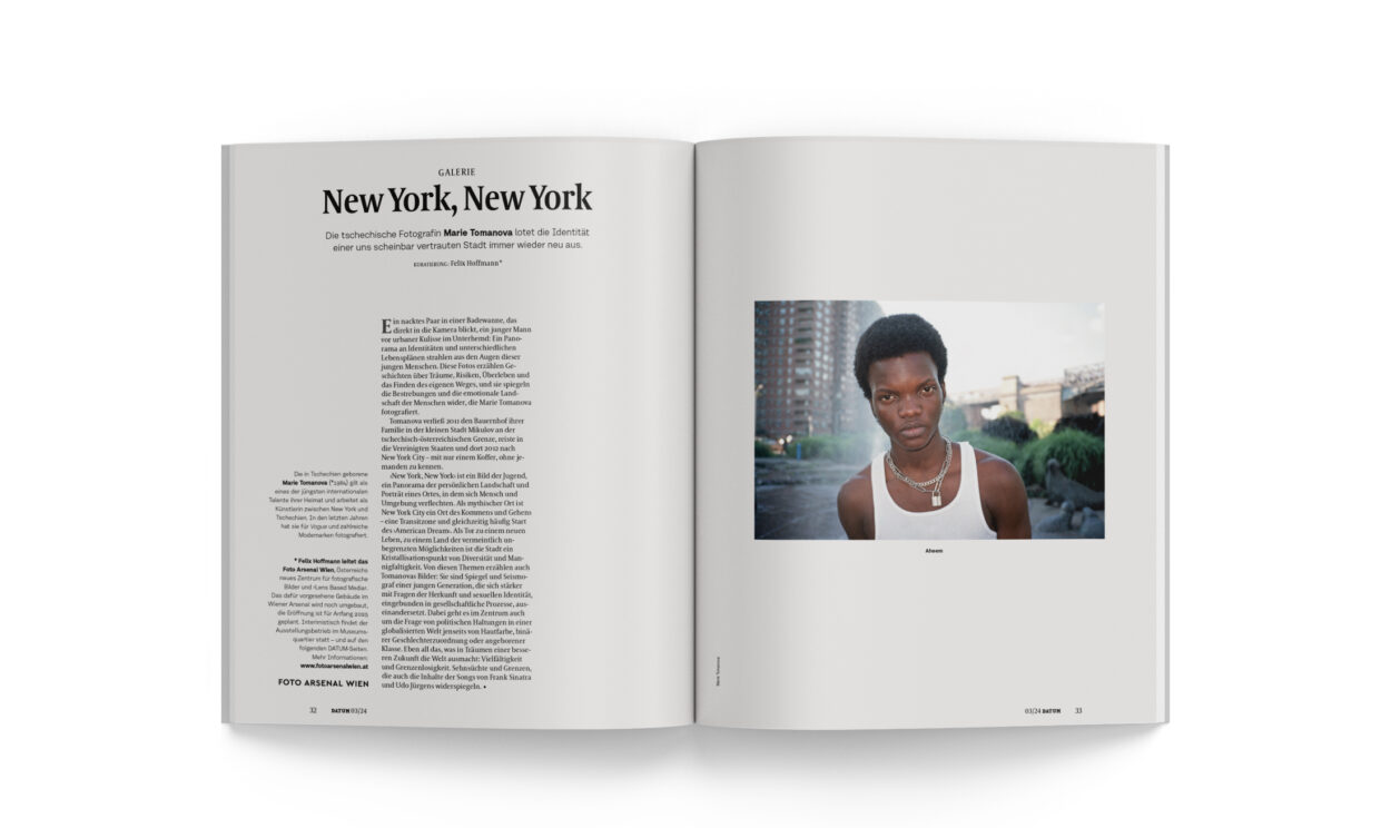›New York, New York‹ ist ein Bild der Jugend, ein Panorama der persönlichen Landschaft und Porträt eines Ortes, in dem sich Mensch und Umgebung verflechten. Als mythischer Ort ist New York City ein Ort des Kommens und Gehens – eine Transitzone und gleichzeitig häufig Start des ›American Dream‹. Als Tor zu einem neuen Leben, zu einem Land der vermeintlich unbegrenzten Möglichkeiten ist die Stadt ein Kristallisationspunkt von Diversität und Mannigfaltigkeit. Von diesen Themen erzählen auch Tomanovas Bilder: Sie sind Spiegel und Seismograf einer jungen Generation, die sich stärker mit Fragen der Herkunft und sexuellen Identität, eingebunden in gesellschaftliche Prozesse, auseinandersetzt. Dabei geht es im Zentrum auch um die Frage von politischen Haltungen in einer globalisierten Welt jenseits von Hautfarbe, binärer Geschlechterzuordnung oder angeborener Klasse. Eben all das, was in Träumen einer besseren Zukunft die Welt ausmacht: Vielfältigkeit und Grenzenlosigkeit. Sehnsüchte und Grenzen, die auch die Inhalte der Songs von Frank Sinatra und Udo Jürgens widerspiegeln. •