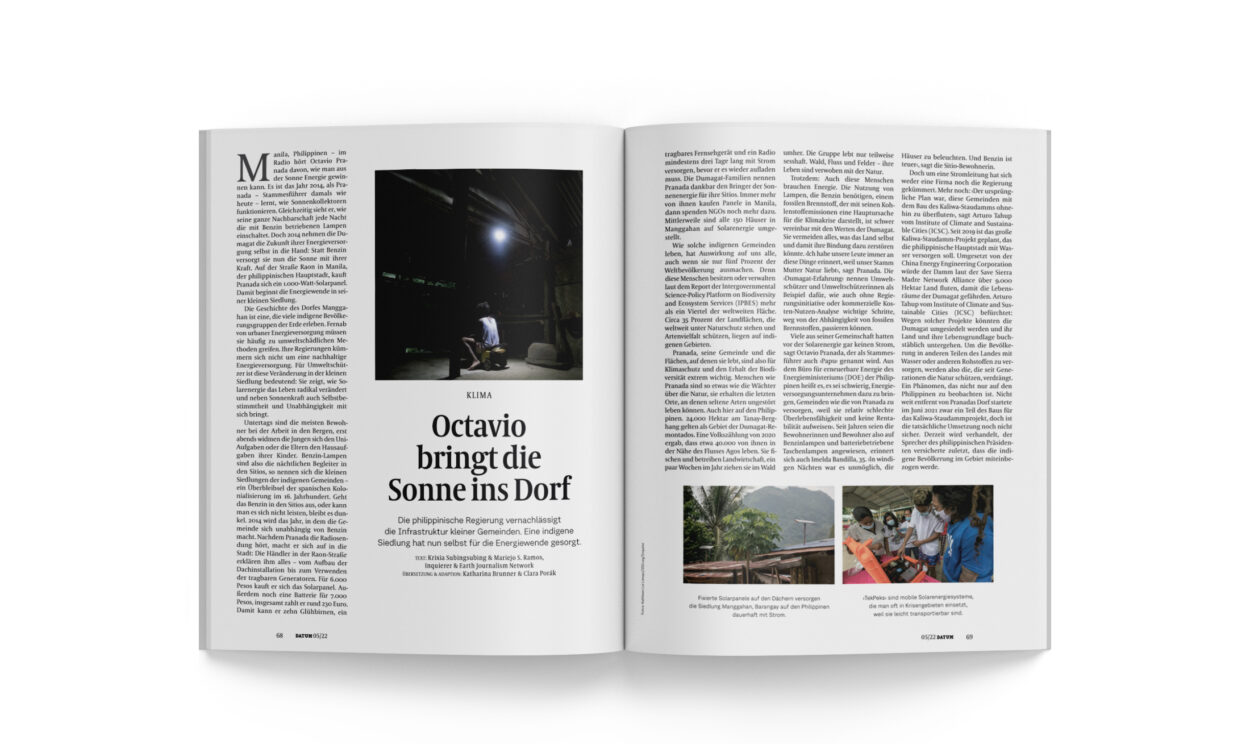 Solarenergie gibt den Dumagat auch eine Widerstandsfähigkeit, die für von Klimakatastrophen bedrohte Gemeinschaften besonders wichtig ist. Ihre Zukunft ist unsicher: Neben Katastrophen, die sie von der Stadt und damit der Versorgung mit Benzin abschneiden könnten, bedrohen auch die Entwaldung in der Sierra Madre und der bevorstehende Bau des Kaliwa-Staudamms in General Nakar, Quezon, die Dumagat-Lebensräume. ›Wir, die Ältesten, geben zu, dass uns die Voraussicht fehlte und wir die Berge für selbstverständlich hielten. Wir dachten nicht, dass der Tag kommen würde, an dem sie in Gefahr geraten‹, erinnert sich Octavio Pranada. Von nun an wollen sie vorausplanen, ›damit die nächsten Generationen diese Probleme nicht erben.‹ •