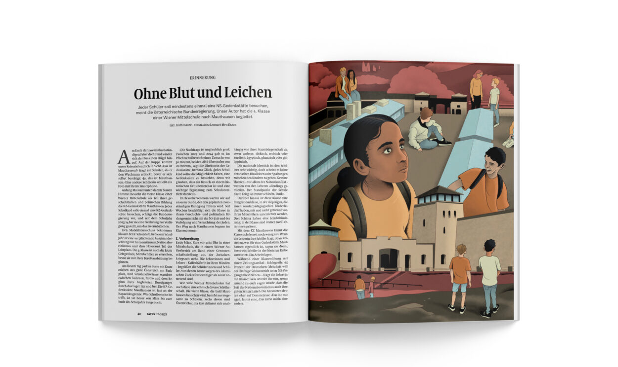 Anfang Mai und unter klarem blauen Himmel besucht die vierte Klasse einer Wiener Mittelschule als Teil ihrer geschichtlichen und politischen Bildung die KZ-Gedenkstätte Mauthausen. Jedes Schulkind solle einmal eine KZ-Gedenkstätte besuchen, schlägt die Bundesregierung vor, und seit dem Schuljahr 2023/24 hat sie eine Förderung zur Verfügung gestellt, um das zu ermöglichen.