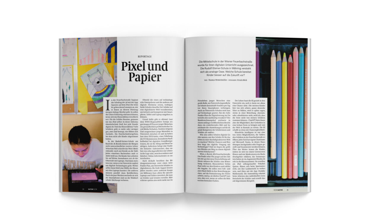 Die Rudolf-Steiner-Schule wie auch die MSi Feuerbachstraße wollen Kinder wie sie auf eine durchdigitalisierte Welt voller Veränderungsprozesse vorbereiten – nur eben mit gänzlich anderen Mitteln. ›Im Kern ähneln sich die beiden Schulen aber mehr, als es scheint‹, sagt Fares Kayali, Digitalexperte an der Universität Wien. Beides seien ›gute Schulen‹, die sich viel Zeit für ihre Schüler nehmen und projektorientiert arbeiten würden. Nur in Fragen der Digitalisierung würden sie unterschiedliche Ansätze verfolgen. Auf den Balanceakt zwischen einem Verbot digitaler Medien und dem Einsatz selbiger angesprochen sagt Lehrer Hub von der Steiner-Schule: ›Ich glaube, das ist eine Suchbewegung zweier Extreme, die eine gesunde Mitte finden müssen.‹
