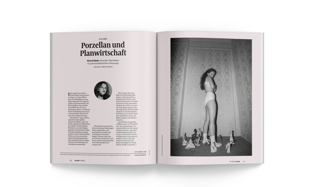 Kincső Bedes Fotografien eröffnen somit zwei Perspektiven: einen lupenartigen, suchenden Blick, der ihre eigene Herkunft abtastet, und einen satellitengleichen Blick, der Fragen von Identität im postsozialistischen Osteuropa verhandelt. 2024 ist dazu der Fotoband ›Porcelain and Wool‹ im Budapester Verlag hECTIC bOOKs erschienen. •
