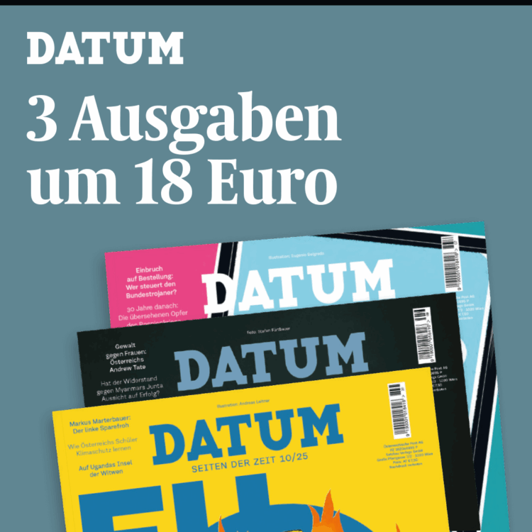Lesen Sie drei Ausgaben DATUM zum einmaligen Vorteilspreis von € 18,–. Das Abo endet danach automatisch, sollten Sie sich nicht für eines unserer Abo-Angebote entscheiden.