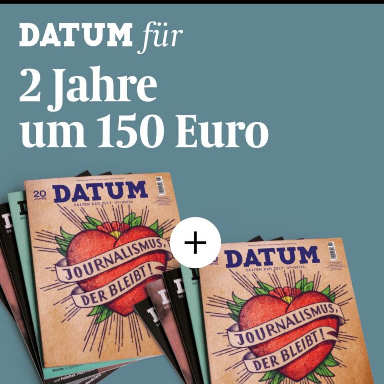 Lesen Sie DATUM zwei Jahre lang (20 Ausgaben) zum Preis von € 150,– inkl. gratis Zustellung. Sie sparen damit 27 % zum Einzelverkauf.