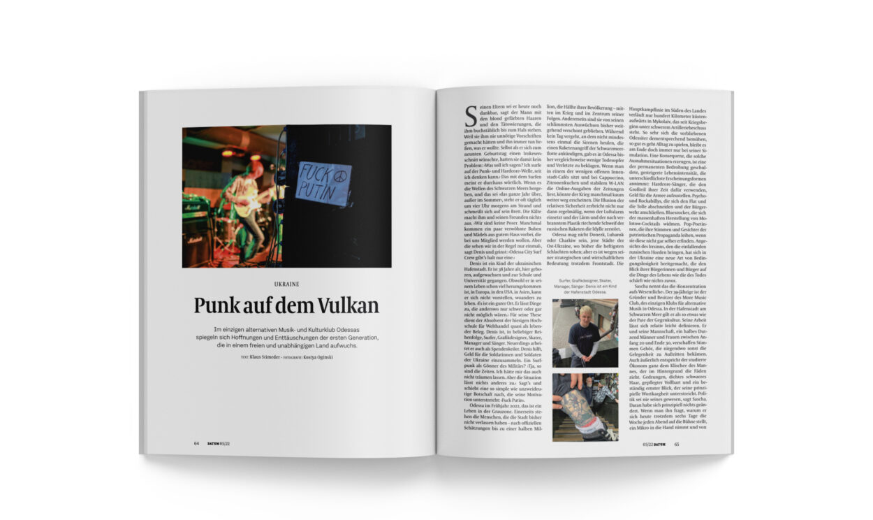 Denis ist ein Kind der ukrainischen Hafenstadt. Er ist 38 Jahre alt, hier geboren, aufgewachsen und zur Schule und Universität gegangen. Obwohl er in seinem Leben schon viel herumgekommen ist, in Europa, in den USA, in Asien, kann er sich nicht vorstellen, woanders zu leben. ›Es ist ein guter Ort. Er lässt Dinge zu, die anderswo nur schwer oder gar nicht möglich wären.‹ Für seine These dient der Absolvent der hiesigen Hochschule für Welthandel quasi als lebender Beleg. Denis ist, in beliebiger Reihenfolge, Surfer, Grafikdesigner, Skater, Manager und Sänger. Neuerdings arbeitet er auch als Spendenkeiler. Denis hilft, Geld für die Soldatinnen und Soldaten der Ukraine einzusammeln. Ein Surfpunk als Gönner des Militärs? ›Tja, so sind die Zeiten. Ich hätte mir das auch nicht träumen lassen. Aber die Situation lässt nichts anderes zu.‹ Sagt’s und schiebt eine so simple wie unzweideutige Botschaft nach, die seine Motivation unterstreicht: ›Fuck Putin‹.