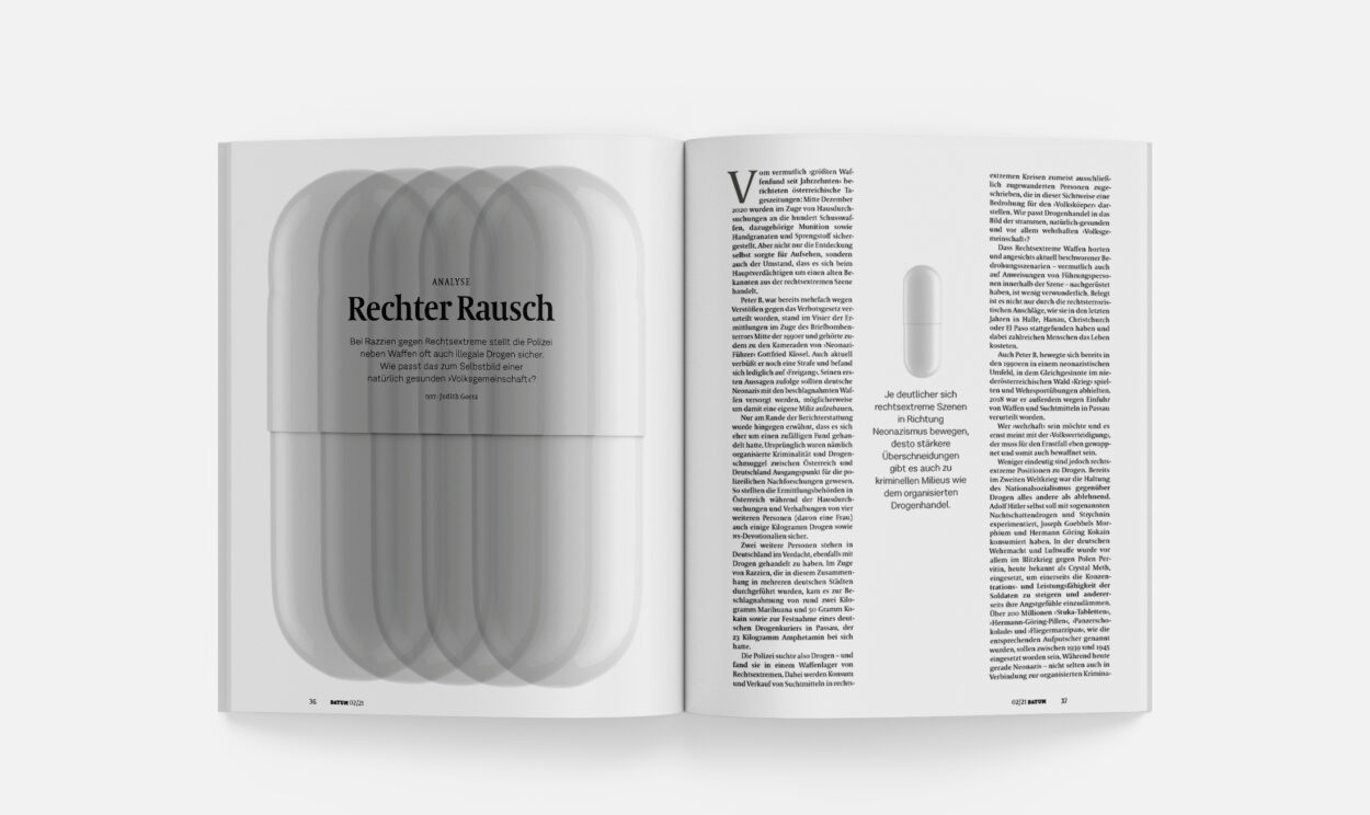 Die Polizei suchte also Drogen – und fand sie in einem Waffenlager von Rechtsextremen. Dabei werden Konsum und Verkauf von Suchtmitteln in rechtsextremen Kreisen zumeist ausschließlich zugewanderten Personen zugeschrieben, die in dieser Sichtweise eine Bedrohung für den › Volkskörper ‹ darstellen. Wie passt Drogenhandel in das Bild der strammen, natürlich-gesunden und vor allem wehrhaften › Volksgemeinschaft ‹ ?