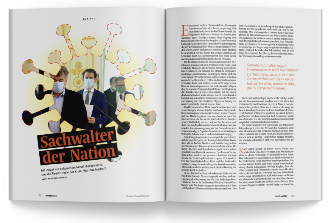Die Reaktionen müssen für jemanden wie den ÖVP-Obmann traumatisch sein. Statt Kontrolle Hohn, statt Ehrfurcht Blamage, als die Kleine Zeitung persönliche Interventionen zur Rettung des plötzlich ramponierten Images publik macht; statt Respekt Häme nach Abschieben der Verantwortung auf Journalisten und anwesende Dorfbewohner. Fehler sind im Drehbuch von Sebastian Kurz und seinem Team nicht vorgesehen. Dass sie dennoch passieren, hat auch etwas Beruhigendes. So stark im Propagandagriff kann eine Regierung die Bevölkerung in einer Demokratie auf die Dauer doch nicht haben; nicht einmal durch einen Bundeskanzler mit autoritären Ambitionen, wie die Neue Zürcher Zeitung oder die Frankfurter Allgemeine Zeitung vermuten; und nicht einmal in einer Krise.