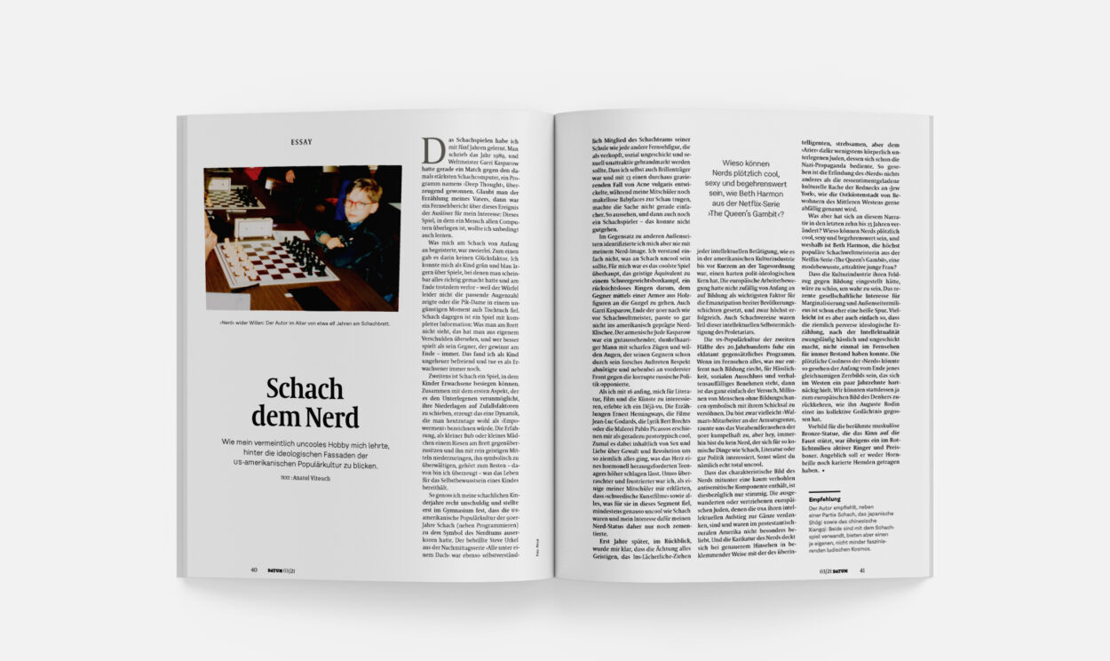 So genoss ich meine schachlichen Kinderjahre recht unschuldig und stellte erst im Gymnasium fest, dass die US-amerikanische Populärkultur der 90er-Jahre Schach (neben Programmieren) zu dem Symbol des Nerdtums auserkoren hatte. Der bebrillte Steve Urkel aus der Nachmittagsserie › Alle unter einem Dach ‹ war ebenso selbstverständlich Mitglied des Schachteams seiner Schule wie jede andere Fernsehfigur, die als verkopft, sozial ungeschickt und sexuell unattraktiv gebrandmarkt werden sollte. Dass ich selbst auch Brillenträger war und mit 13 einen durchaus gravierenden Fall von Acne vulgaris entwickelte, während meine Mitschüler noch makellose Babyfaces zur Schau trugen, machte die Sache nicht gerade einfacher. So aussehen, und dann auch noch ein Schachspieler – das konnte nicht gutgehen.
