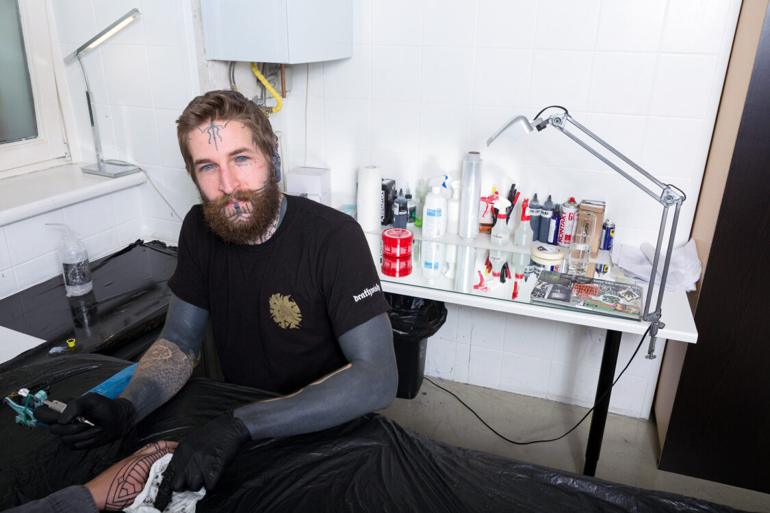 Es ist ein Ritual, das sehr schmerzhaft ist. Es ist schwer zu erklären, was da abgeht, auch zwischen mir und dem Kunden. Definitiv ist es eine Art der Kommunikation und Beziehung. Die Leute, die ich oft tätowiere, sind auch irgendwo meine Freunde. Wenn es zwischenmenschlich nicht passt, tätowiere ich nicht. Mit manchen kannst du, mit manchen nicht, so ist es auch beim Tätowieren. Da gehts nicht ums Geld oder darum, ob ich muss: Ich muss gar nichts. Da gehts um Austausch und Erfahrung.