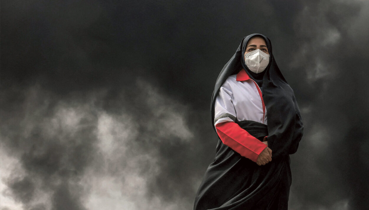 Schwarzes Kopftuch, schwarzer Rock, dazu eine Gesichtsmaske gegen die Toxine, die sich Anfang März als dichter schwarzer Rauch über Teheran legen. Eine Mitarbeiterin des Roten Halbmonds steht in der Nähe einer jener Raffinerien, in denen es während der Angriffe der israelischen und US-amerikanischen Armeen Anfang März zu massiven Explosionen kam. Die 15 Millionen Einwohner der iranischen Metropolregion wurden eindringlich gewarnt, ihre Häuser nicht zu verlassen, Masken zu tragen und sich nach Kontakt mit Regen sofort abzuwaschen.