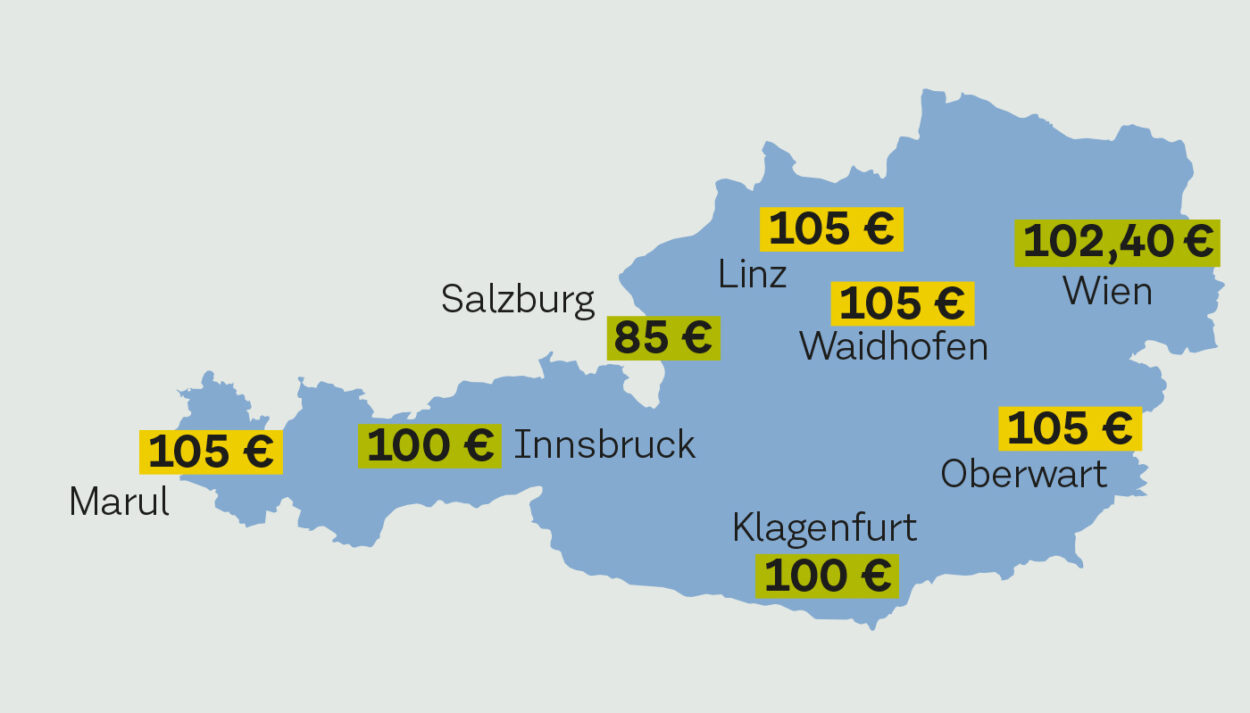 Subtil unterschiedlich ist auch die Höhe, die hier für ausgewählte Metropolen des Landes dargestellt wird. Die von den ÖBB verlangten 105 € bei Sofortzahlung gelten etwa auch in Marul und Oberwart, während man in Salzburg, Innsbruck oder Klagenfurt billiger davonkommt. Häufig werden noch mit großer Liebe Ermäßigungen für Kinder oder Aufschläge bei späterer Bezahlung normiert.