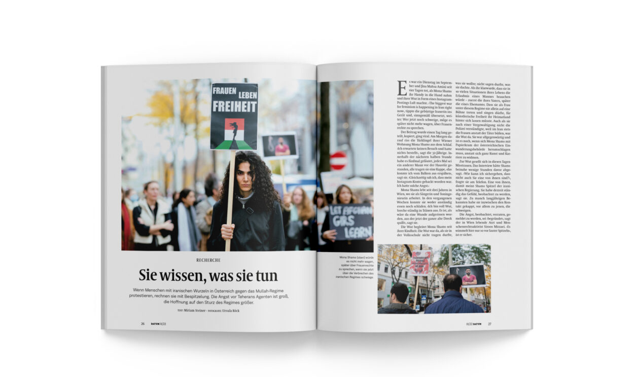Als am ersten Oktobersamstag erstmals mehr als 2.000 Menschen auf dem Wiener Stephansplatz ihre Stimmen für ›Frauen, Leben, Freiheit‹ im Iran erhoben, servierte die Studentin Nil Käsespätzle. Diese standen an jenem Tag auf dem Menü des Wiener Cafés, in dem die gebürtige Iranerin kellnert. ›Ich wollte unbedingt an der Demo teilnehmen. Alle meine Freundinnen gingen hin, auch die sonst so vorsichtigen‹, erzählt sie. Die Schicht im Kaffeehaus konnte sie aber nicht absagen, ›ich brauche ja das Geld‹.