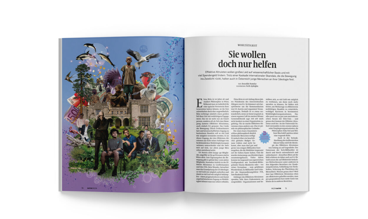 Elena Bräu ist 20 Jahre alt und studiert Philosophie in Wien. Während man sie äußerlich für eine typische Vertreterin ihrer Generation halten könnte, ist ihr Freizeitverhalten doch eher ungewöhnlich: Bräu verbringt nämlich einen großen Teil ihrer Zeit mit wohltätigem Engagement. Das tut sie nicht nur als Einzelperson, sondern oft als Teil einer Bewegung namens ›Effektiver Altruismus‹, auch einfach EA genannt. Das Credo der Bewegung: Durch Evidenzbasiertheit und wissenschaftlichen Zugang zu karitativem Handeln soll so viel Leid wie möglich vermieden werden. Es ist dieser Zugang, der den Effektiven Altruismus aus Sicht seiner Anhänger von herkömmlichen Wohltätigkeitsorganisationen unterscheidet und der weltweit auf viele, vor allem junge Menschen anziehend wirkt.