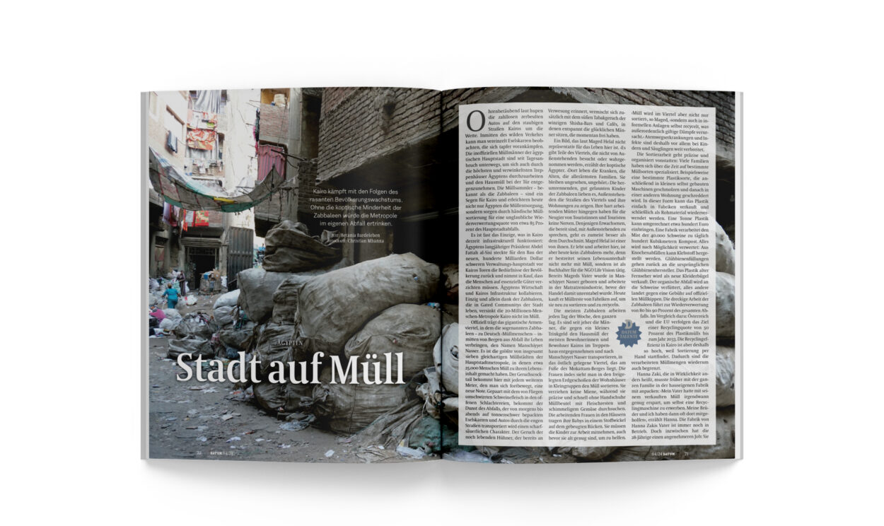 Offiziell trägt das gigantische Armenviertel, in dem die sogenannten Zabbaleen – zu Deutsch ›Müllmenschen‹ – inmitten von Bergen aus Abfall ihr Leben verbringen, den Namen Manschiyyet Nasser. Es ist die größte von insgesamt sieben gleichartigen Müllstädten der Hauptstadtmetropole, in denen etwa 25.000 Menschen Müll zu ihrem Lebensinhalt gemacht haben. Der Geruchscocktail bekommt hier mit jedem weiteren Meter, den man sich fortbewegt, eine neue Note. Gepaart mit dem von Fliegen umschwirrten Schweinefleisch in den offenen Schlachtereien, bekommt der Dunst des Abfalls, der von morgens bis abends auf tonnenschwer bepackten Eselskarren und Autos durch die engen Straßen transportiert wird einen scharf-säuerlichen Charakter. Der Geruch der noch lebenden Hühner, der bereits an Verwesung erinnert, vermischt sich zusätzlich mit dem süßen Tabakgeruch der winzigen Shisha-Bars und Cafés, in denen entspannt die glücklichen Männer sitzen, die momentan frei haben.
