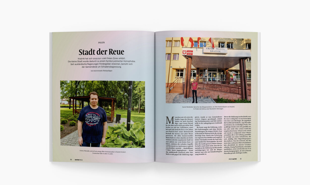 Menschen wie ich seien des Teufels. Sogar der Hexerei haben sie mich beschuldigt ‹, sagt Cezary Nieradko, der aber auch schon gar nichts Teuflisches an sich hat. Schüchtern, sensibel und sehr bedacht lässt er im Johannes-Paul-II.-Park seiner Heimatstadt Kraśnik die letzten zwei Jahre Revue passieren. Als offen homosexueller Mann hatte er es hier ohnehin nie leicht. Seitdem sich die ostpolnische Stadt vor zwei Jahren zur › LGBT-freien Zone ‹ erklärte, nahmen die verbalen Angriffe auf ihn massiv zu. Auch wenn er optisch unscheinbar aussieht – dunkelblaues T-Shirt, kurze Jogginghosen – kennt ihn mittlerweile praktisch jeder hier. Weil er sich gegen die Erklärung engagierte, wurde er von Gemeindevertretern › Lügner ‹ geschimpft, erhielt zig Hasskommentare und lebt mittlerweile in der nahegelegenen Großstadt Lublin.