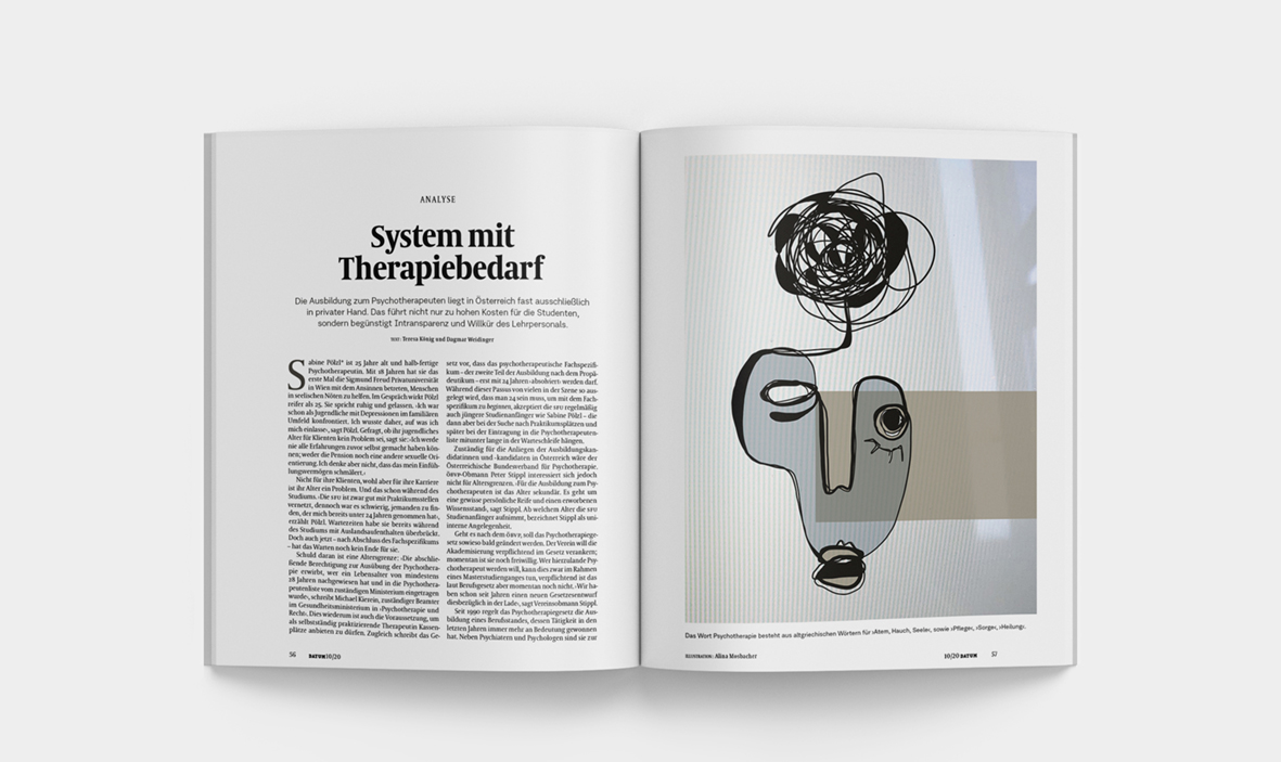 Sabine Pölzl* ist 25 Jahre alt und halb-fertige Psychotherapeutin. Mit 18 Jahren hat sie das erste Mal die Sigmund Freud Privatuniversität in Wien mit dem Ansinnen betreten, Menschen in seelischen Nöten zu helfen. Im Gespräch wirkt Pölzl reifer als 25. Sie spricht ruhig und gelassen. › Ich war schon als Jugendliche mit Depressionen im familiären Umfeld konfrontiert. Ich wusste daher, auf was ich mich einlasse ‹, sagt Pölzl. Gefragt, ob ihr jugendliches Alter für Klienten kein Problem sei, sagt sie : › Ich werde nie alle Erfahrungen zuvor selbst gemacht haben können; weder die Pension noch eine andere sexuelle Orientierung. Ich denke aber nicht, dass das mein Einfühlungsvermögen schmälert. ‹