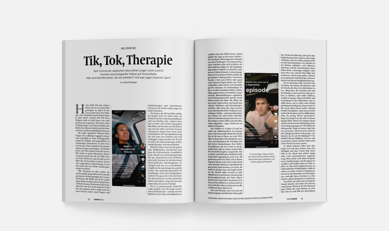 Heute fühlt Vik sich schwer. Noch ehe sie aus dem Bett gestiegen ist, spürt sie die Last in jeder Faser ihres Körpers. Das Aufstehen macht keinen Sinn. Es gibt nichts, worauf sich Vik freut. Morgen sieht es nicht besser aus, und gestern war es genauso. Vik seufzt, tastet in Rückenlage nach ihrem Handy und klickt das schwarze Symbol mit der bunten Note auf ihrem Handybildschirm an. Vik heißt eigentlich Viktoria Wimberger. Die 21-Jährige engagiert sich gerade freiwillig in einer Wohngemeinschaft für Kinder und Jugendliche in schwierigen Situationen. In ihrer Freizeit kreisen Viks Gedanken oft um ihre eigenen Sorgen und Ängste. Auf Tiktok kann sich Vik einfach berieseln lassen. Hier sieht sie andere Menschen, denen es genauso geht wie ihr. Sie fühlt, dass sie nicht alleine ist, und ab und zu entfährt ihr ein herzliches Lachen. Das ist eine angenehme Abwechslung, in der das Leben für eine Weile einmal ganz simpel erscheint.