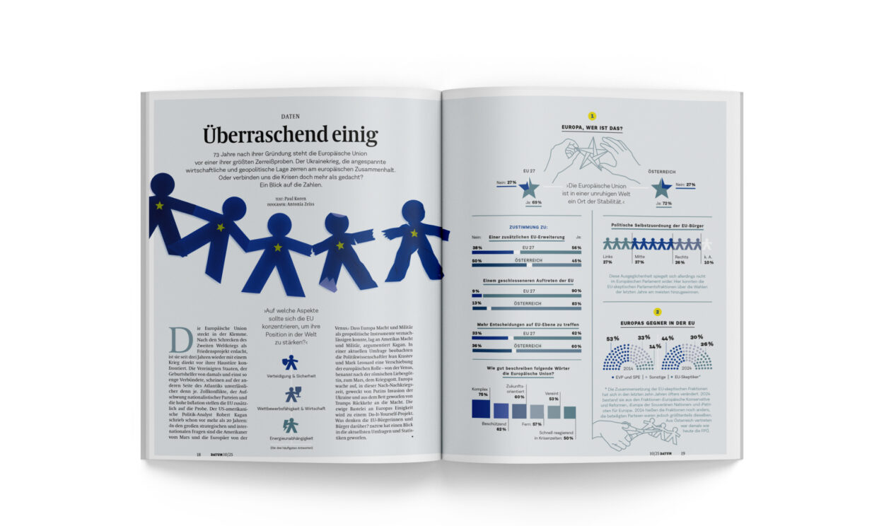 Europa wache auf, in dieser Nach-Nachkriegszeit, geweckt von Putins Invasion der Ukraine und aus dem Bett geworfen von Trumps Rückkehr an die Macht. Die ewige Bastelei an Europas Einigkeit wird zu einem Do-It-Yourself-Projekt. Was denken die EU-Bürgerinnen und Bürger darüber? DATUM hat einen Blick in die aktuellsten Umfragen und Statistiken geworfen. •