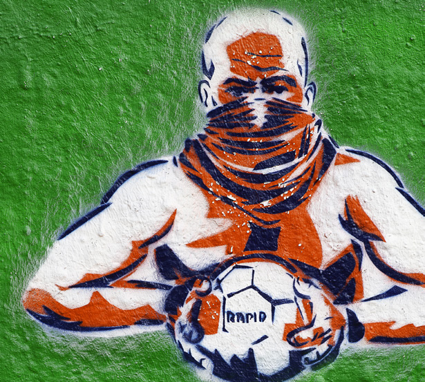 Eine Religion mit zerstörerischer Kraft: Domenico Jacono war Mitglied der ›Hütteldorfer Terrorszene‹, einer Vorläuferorganisation der Ultras, die sich diesen Namen selbst gab. Die Herkunft von Jaconos Vater, der aus der Nähe von Neapel stammt, brachte ihn früh in Kontakt mit italienischer Fankultur. Er wäre Gründungsmitglied der Ultras geworden, wäre er damals nicht wegen Landfriedensbruch in Bayern eingesessen. Heute kann man ihn oft im Café Weidinger antreffen. An einem drückend heißen Sommertag sitzt Jacono mit einer Schirmmütze im schattigen Garten seines Stammcafés im 16. Bezirk: ›Die Ultras setzen sich selbst Prämissen wie Kompromisslosigkeit, ohne Rücksicht auf Nachteile für die eigene Person. Sie stecken ihre Lebensenergie rein und erwarten dafür etwas retour. Wenn das nicht kommt, dann kann sich die positive in negative Zuneigung umdrehen.‹ Jacono kennt Rapid wie wenige andere. Nach seiner Haftstrafe hatte er sich zwar eine Auszeit vom Fantum gegönnt und Literaturwissenschaften studiert, in den Nullerjahren kam er aber mit umso mehr Hingabe zurück. Er wurde Kurator des vereinseigenen Museums, Mitglied des Ethikrates und so etwas wie der offizielle Vereinshistoriker. Ein Mann, der das Ultras-Motto ›Rapid Wien Lebenssinn‹ gelebt hatte. Heute geht er nicht mehr ins Stadion. Er ist zu enttäuscht vom Verein, der seine Wurzeln verraten habe: ›Der Arbeiterverein Rapid ist diese Saison puncto Stehplatz-Einzelkarte und Bier der teuerste Verein der österreichischen Bundesliga.‹