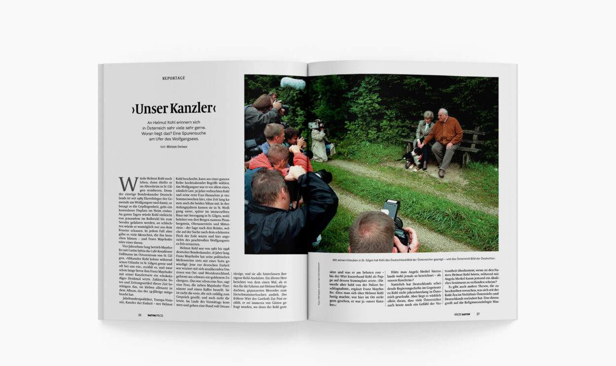 Jahrhundertpolitiker, Europa-Visionär, Kanzler der Einheit – wer Helmut Kohl beschreibt, kann aus einer ganzen Reihe hochtrabender Begriffe wählen. Am Wolfgangsee war er vor allem eines, nämlich Gast. 30 Jahre verbrachten Kohl und seine erste Frau Hannelore je vier Sommerwochen hier, eine Zeit lang kamen auch die beiden Söhne mit. In den Anfangsjahren kamen sie in St. Wolfgang unter, später im immerselben Haus mit Seezugang in St. Gilgen, wohl behütet von drei Bergen namens Plombergstein, Obenauerstein und Mitterstein – der Sage nach drei Brüder, welche auf der Suche nach dem schönsten Fleck der Erde waren und hier angesichts des prachtvollen Wolfgangsees zu Fels erstarrten.