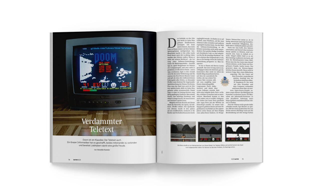 Der Gedanke an den Teletext weckt in Lukas Neugebauer Kindheitserinnerungen: ›Ich kann mich erinnern, dass mein Papa zu Hause immer auf dem Teletext Sportergebnisse nachgeschaut hat.‹ Manchmal mache er das selber noch. Doch heute nutzt der 31-jährige Informatiker den Teletext anders: Wenn er nicht mit seinem Brotberuf – der Leitung eines Software-Entwicklungsteams für Medizinprodukte – beschäftigt ist, spielt Neugebauer im Teletext ein Computerspiel, und zwar nicht irgendeines. Er übt sich in Doom – zuerst 1993 erschienen, legte es den ›Grundstein für die weite Verbreitung und Akzeptanz des First-Person-Shooter-Genre und gilt als eines der einflussreichsten Videospiele aller Zeiten‹, so Alexander Pfeiffer vom Zentrum für Angewandte Spieleforschung der Donau-Uni Krems. Dass man das Spiel nun auch im Teletext spielen kann, dafür ist Lukas Neugebauer selbst verantwortlich. Damit folgt er einer in Gaming-Kreisen sorgfältig gepflegten Tradition: Man nimmt Doom, eine beliebige Hardware, und tüftelt so lange herum, bis man Ersteres auf Zweiterer spielen kann.
