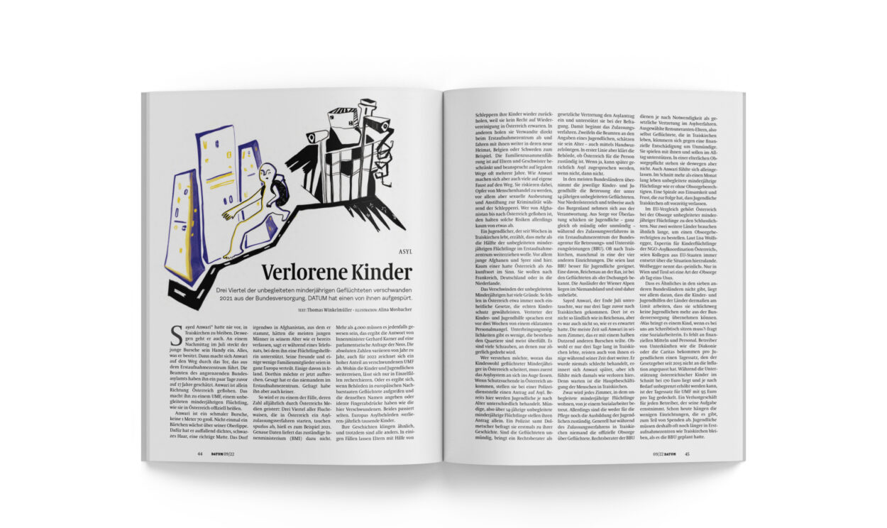 So wird er zu einem der Fälle, deren Zahl alljährlich durch Österreichs Medien geistert: Drei Viertel aller Fluchtwaisen, die in Österreich ein Asylzulassungsverfahren starten, tauchen spurlos ab, hieß es zum Beispiel 2021. Genaue Daten liefert das zuständige Innenministerium (BMI) dazu nicht. Mehr als 4.000 müssen es jedenfalls gewesen sein, das ergibt die Antwort von Innenminister Gerhard Karner auf eine parlamentarische Anfrage der Neos. Die absoluten Zahlen variieren von Jahr zu Jahr, auch für 2022 zeichnet sich ein hoher Anteil an verschwundenen UMF ab. Wohin die Kinder und Jugendlichen weiterreisen, lässt sich nur in Einzelfällen recherchieren. Oder es ergibt sich, wenn Behörden in europäischen Nachbarstaaten Geflüchtete aufgreifen und die denselben Namen angeben oder idente Fingerabdrücke haben wie die hier Verschwundenen. Beides passiert selten. Europas Asylbehörden ›verlieren‹ jährlich tausende Kinder.