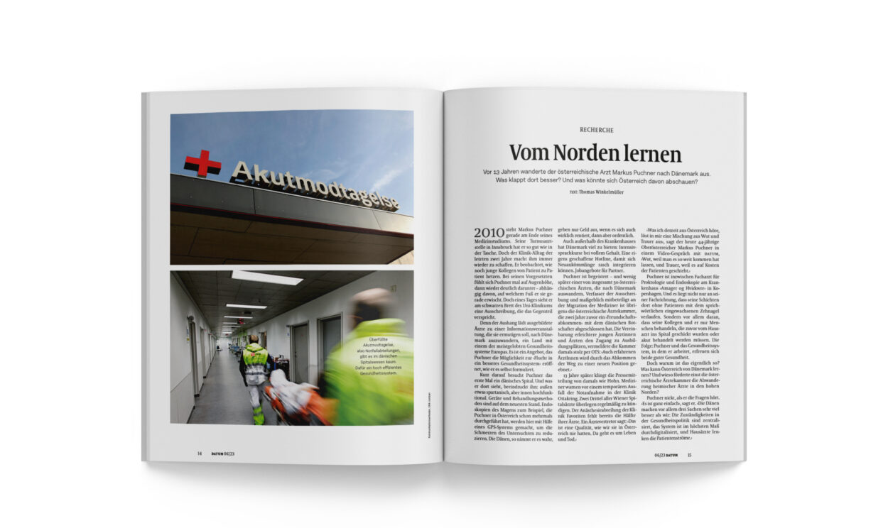 Denn der Aushang lädt ausgebildete Ärzte zu einer Informationsveranstaltung, die sie ermutigen soll, nach Dänemark auszuwandern, ein Land mit einem der meistgelobten Gesundheitssysteme Europas. Es ist ein Angebot, das Puchner die Möglichkeit zur ›Flucht in ein besseres Gesundheitssystem‹ eröffnet, wie er es selbst formuliert.
