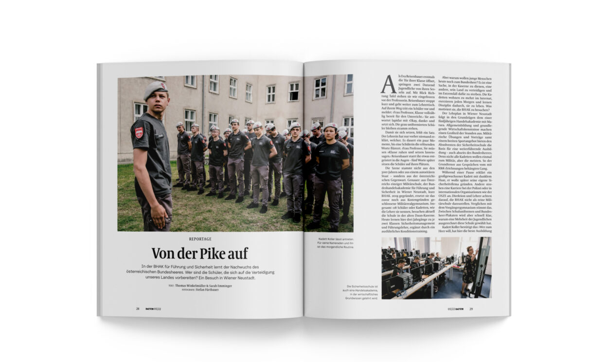 Die Szene stammt nicht aus den 50er-Jahren oder aus einem autoritären Staat – sondern aus der österreichischen Gegenwart. Genauer: aus Österreichs einziger Militärschule, der Bundeshandelsakademie für Führung und Sicherheit in Wiener Neustadt, kurz BHAK. 2019 gegründet, ersetzt sie das zuvor noch aus Kostengründen geschlossene Militärrealgymnasium. Insgesamt 118 Schüler oder Kadetten, wie die Lehrer sie nennen, besuchen aktuell die Schule in der alten Daun-Kaserne. Heute lernen hier drei Jahrgänge zu je zwei Klassen Sicherheitsmanagement und Führungslehre, ergänzt durch ein ausführliches Konditionstraining.