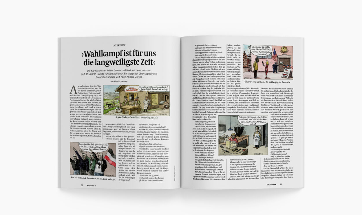 Aschaffenburg liegt im Westen Unterfrankens, also da, wo Bayern an Hessen grenzt. Achim Greser (Jahrgang 1961) und Heribert Lenz (Jahrgang 1958) haben sich bewusst für ein Leben in der Provinz entschieden. Sie würden Witze zeichnen wie andere Brot backen, sagen sie, und so eine Witze-Manufaktur passe eben besser aufs Land. In einem Haus, das in zwei Wohnungen und ein gemeinsames Atelier aufgeteilt ist, sind in den vergangenen Jahrzehnten tausende ihrer notorisch respektlosen, aber ebenso liebevoll ausgestatteten Karikaturen entstanden. › Greser und Lenz haben bundesrepublikanische Geschichte von unten gezeichnet ‹, schrieb die Süddeutsche vor Kurzem über die Männer, die vor allem für Titanic und die FAZ gearbeitet haben. Als DATUM in Aschaffenburg anruft, hebt Achim Greser ab.