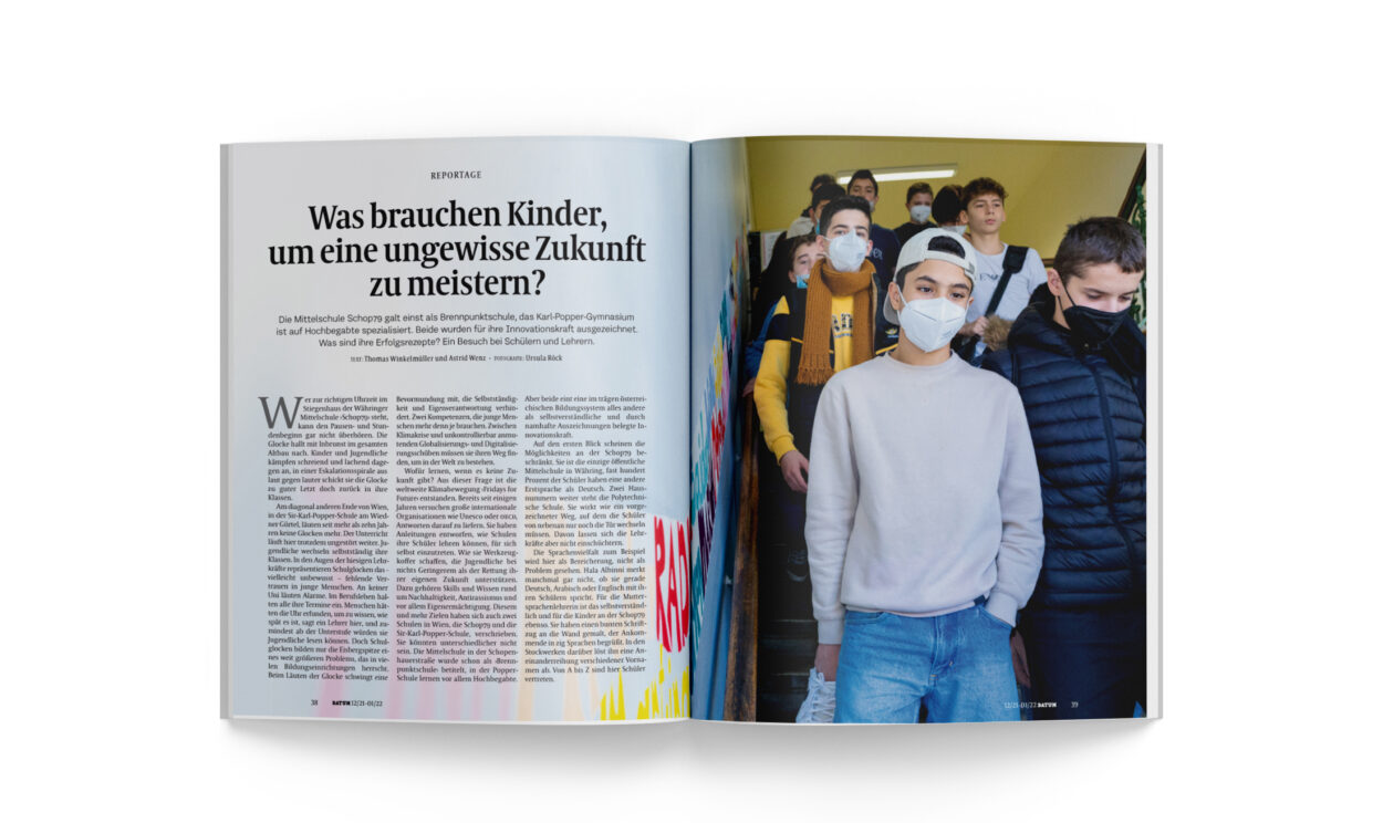 Wofür lernen, wenn es keine Zukunft gibt? Aus dieser Frage ist die weltweite Klimabewegung ›Fridays for Future‹ entstanden. Bereits seit einigen Jahren versuchen große internationale Organisationen wie Unesco oder oecd, Antworten darauf zu liefern. Sie haben Anleitungen entworfen, wie Schulen ihre Schüler lehren können, für sich selbst einzutreten. Wie sie Werkzeugkoffer schaffen, die Jugendliche bei nichts Geringerem als der Rettung ihrer eigenen Zukunft unterstützen. Dazu gehören Skills und Wissen rund um Nachhaltigkeit, Antirassismus und vor allem Eigenermächtigung. Diesem und mehr Zielen haben sich auch zwei Schulen in Wien, die Schop79 und die Sir-Karl-Popper-Schule, verschrieben. Sie könnten unterschiedlicher nicht sein. Die Mittelschule in der Schopenhauerstraße wurde schon als ›Brennpunktschule‹ betitelt, in der Popper- Schule lernen vor allem Hochbegabte. Aber beide eint eine im trägen österreichischen Bildungssystem alles andere als selbstverständliche und durch namhafte Auszeichnungen belegte Innovationskraft.