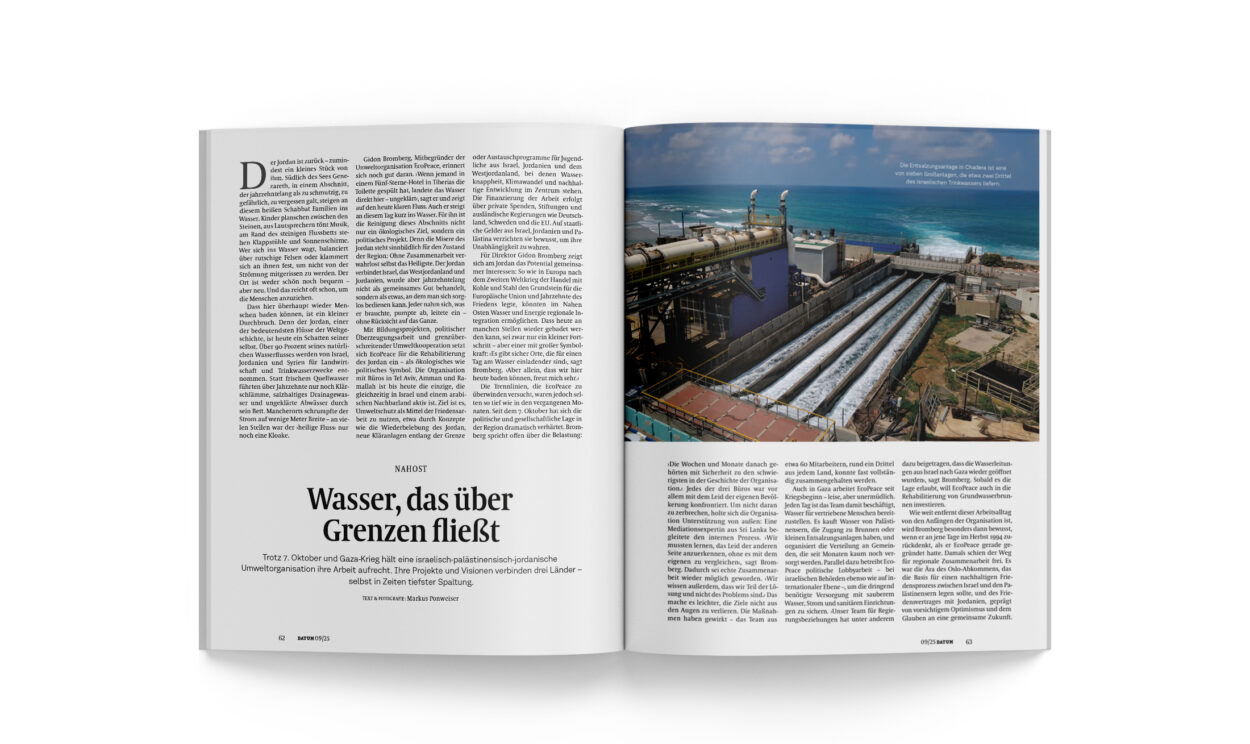Gidon Bromberg, Mitbegründer der Umweltorganisation EcoPeace, erinnert sich noch gut daran. ›Wenn jemand in einem Fünf-Sterne-Hotel in Tiberias die Toilette gespült hat, landete das Wasser direkt hier – ungeklärt‹, sagt er und zeigt auf den heute klaren Fluss. Auch er steigt an diesem Tag kurz ins Wasser. Für ihn ist die Reinigung dieses Abschnitts nicht nur ein ökologisches Ziel, sondern ein politisches Projekt. Denn die Misere des Jordan steht sinnbildlich für den Zustand der Region: Ohne Zusammenarbeit verwahrlost selbst das Heiligste. Der Jordan verbindet Israel, das Westjordanland und Jordanien, wurde aber jahrzehntelang nicht als gemeinsames Gut behandelt, sondern als etwas, an dem man sich sorglos bedienen kann. Jeder nahm sich, was er brauchte, pumpte ab, leitete ein – ohne Rücksicht auf das Ganze.